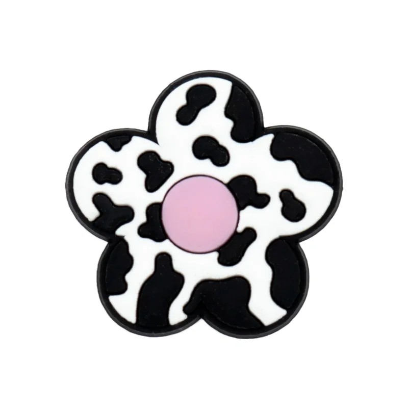 Dekorace na crocsy květina s kravským vzorem 2–3 cm PVC černo bílá ozdoba do bot doplněk pro crocs obuv s růžovým středem