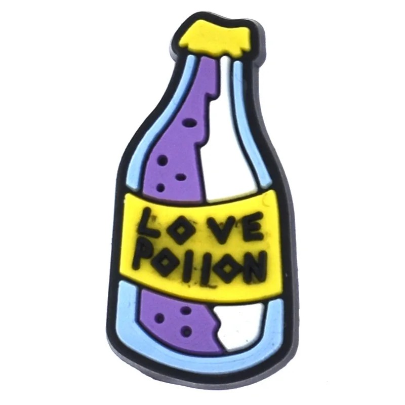 Dekorace na crocsy ve tvaru lahvičky představuje originální doplněk pro úpravu vzhledu nazouvací obuvi s otvory. Design obsahuje motiv lahvičky s nápisem „LOVE POTION“, který je díky kontrastním barvám dobře viditelný. Tento prvek dodává obuvi zajímavý detail a umožňuje její jednoduché přizpůsobení.