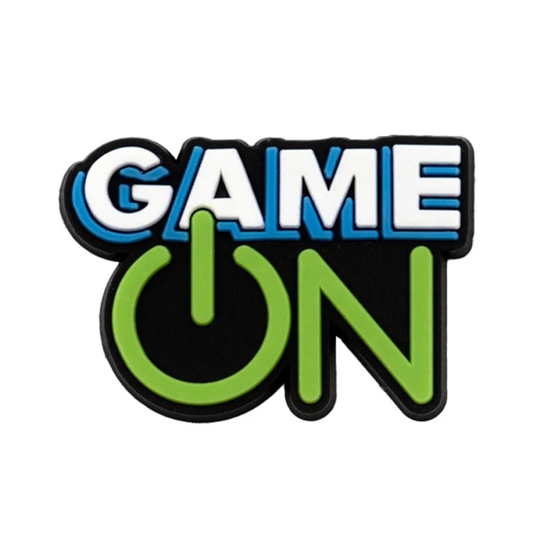 Dekorace na crocsy s nápisem Game On představuje výrazný herní doplněk, který snadno oživí vzhled obuvi. Kombinace černého podkladu s bílým, modrým a zeleným prvkem vytváří kontrastní design, který je dobře viditelný. Motiv vychází z herního prostředí a připomíná začátek hry nebo aktivaci režimu.