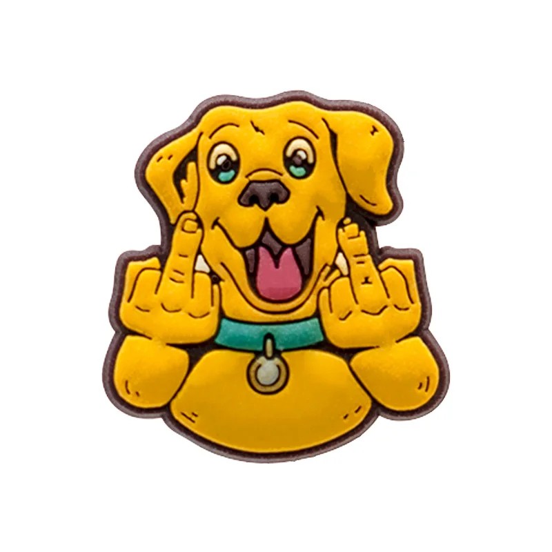 Dekorace na crocsy s motivem psa je výrazný doplněk do bot, který na první pohled zaujme kresleným provedením a nápadným gestem. Na obrázku je jasně vidět pes s prostředníčky, otevřenou tlamou, obojkem a výraznou mimikou. Motiv působí jako stylizovaná ilustrace s čitelnými obrysy, takže je dobře rozpoznatelný i při menším formátu. Ozdoba je vhodná pro crocsy i další nazouváky s otvory. Díky zřetelnému designu se hodí jako samostatný dominantní detail na obuvi.