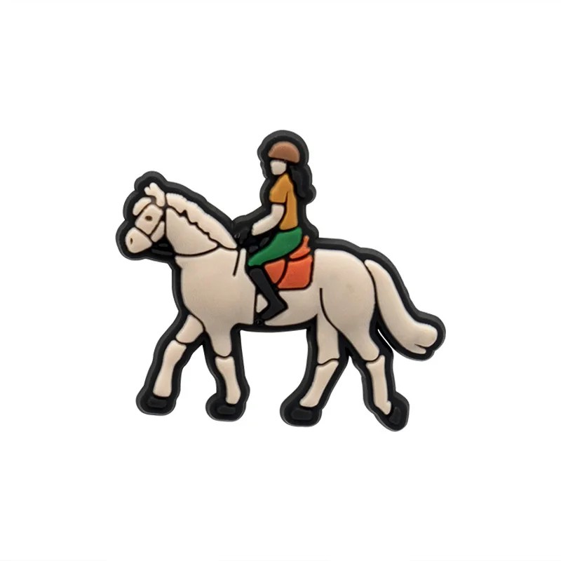 Dekorace na crocsy s motivem postavy na koni představuje zajímavý doplněk pro úpravu vzhledu obuvi. Detailní zpracování zahrnuje jezdce i koně, což vytváří výrazný vizuální prvek. Motiv postavy na koni v bílo hnědém provedení působí přirozeně a dobře vynikne na různých typech bot.