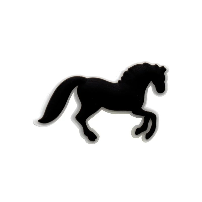 Dekorace na crocsy siluleta koně 2–3 cm PVC černá ozdoba do bot doplněk pro crocs obuv s motivem zvířete a jezdeckým stylem