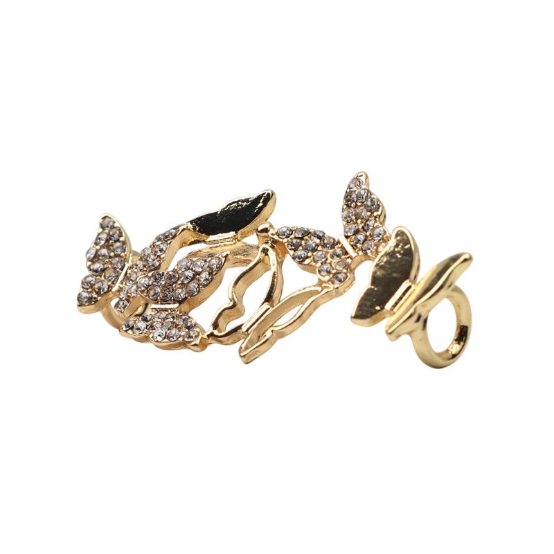 Provedení kombinuje kovový základ s ozdobnými kamínky. Zlatá barva tvoří hlavní část dekorace a je doplněna drobnými kamínky, které vytvářejí jemný lesk a zvýrazňují tvar jednotlivých motýlků. Povrch je detailně zpracovaný a jednotlivé prvky jsou rovnoměrně rozmístěné.