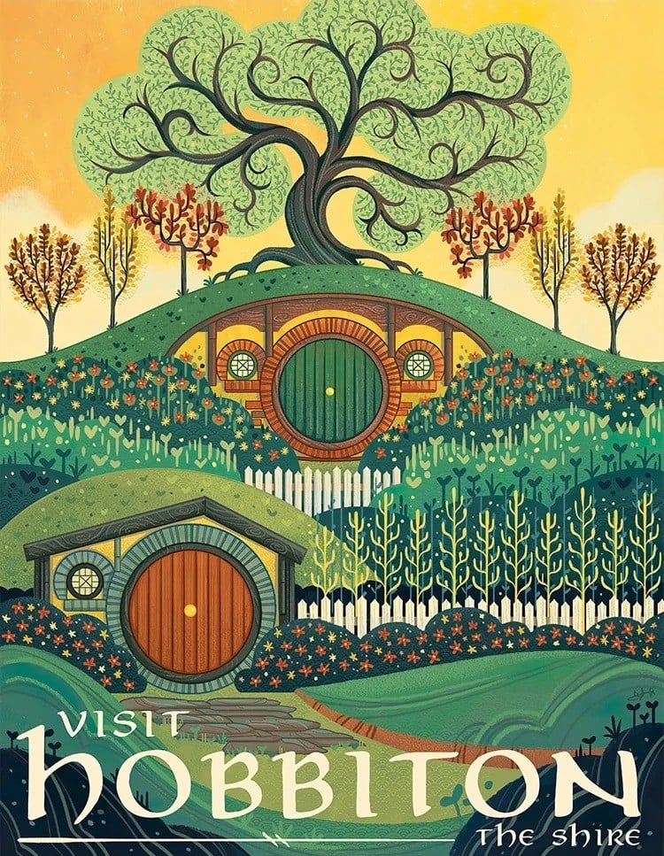 • Fantasy motiv Hobitína s krajinou a kulatými domky