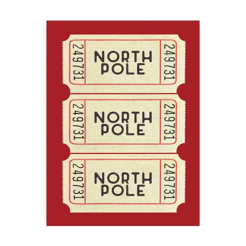 Plakát s motivem jízdenek North Pole na červeném pozadí ve formátu 30 × 40 cm. Plátěný tisk vhodný pro vánoční dekoraci stěny. Celý popis