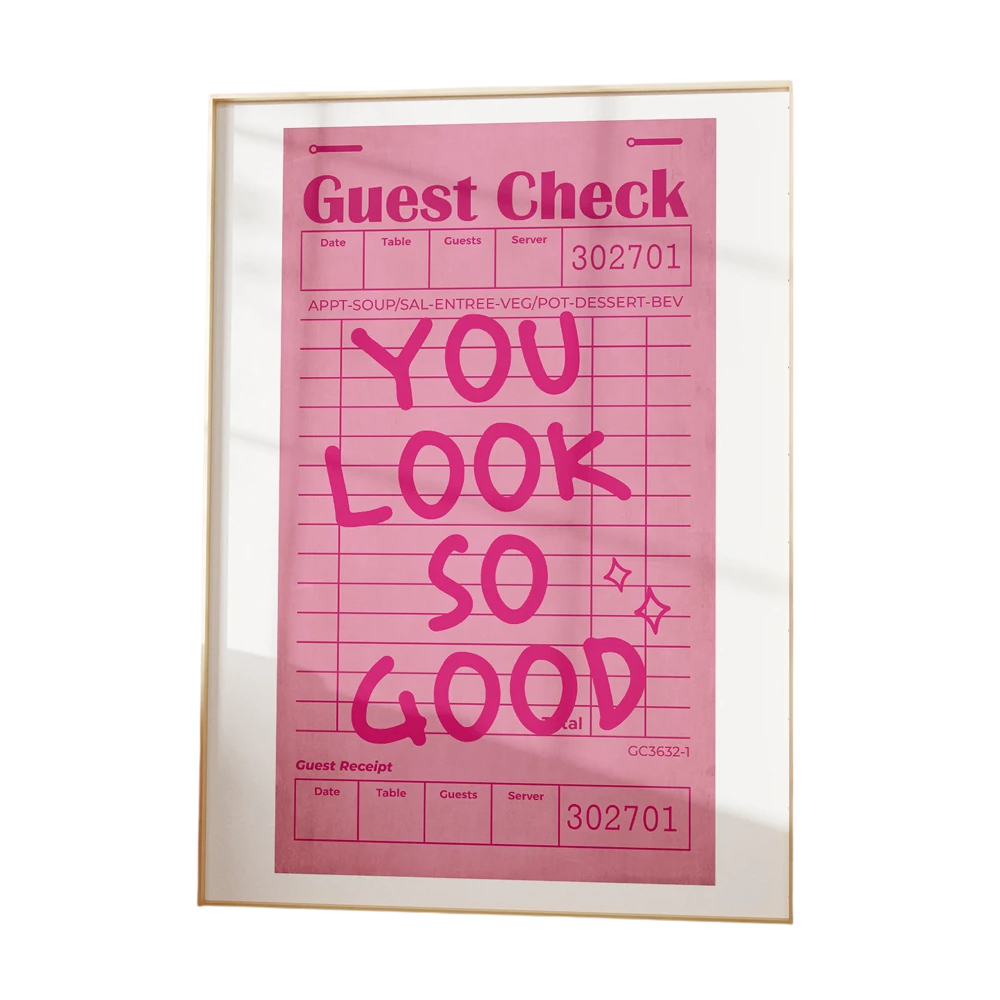 Plakát je zpracován technologií tisku na plátno, která dodává povrchu charakteristickou strukturu. Jedná se o měkký plakát, který je lehký a snadno se instaluje. Větší formát 40 × 60 cm umožňuje jeho umístění jako dominantního prvku na stěně. Hlavním vizuálním prvkem je růžový pochvalný nápis „You Look So Good”, který je dobře viditelný i z větší vzdálenosti. Produkt je dodáván bez rámu, což umožňuje zvolit způsob uchycení podle vlastních preferencí.