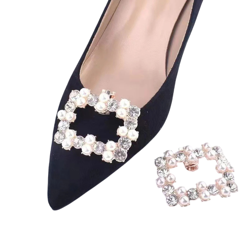 Dekorativní spona na lodičky s obdélníkovým rámem je výrazný doplněk, který dokáže snadno proměnit vzhled obuvi. Kombinace imitace perliček a kamínků vytváří detailní dekor, jenž upoutá pozornost na první pohled. Spona je navržena tak, aby se stala dominantním prvkem na špičce boty.
