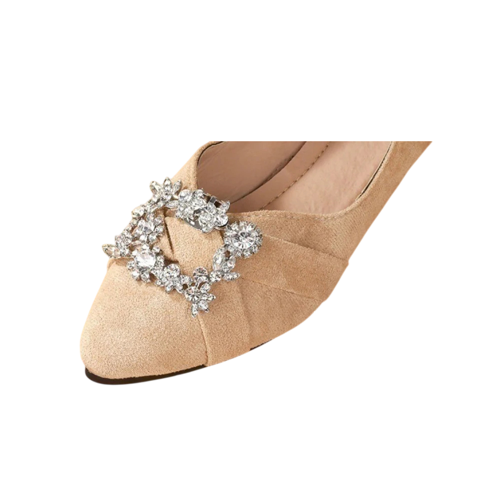 Dominantním prvkem je zdobený obdélníkový tvar s kamínky, který vytváří jemný lesklý efekt. Kamínky jsou rozmístěny po celé ploše a doplněny dekorativními prvky, což dodává sponě detailní a propracovaný vzhled. Tento design zaujme na první pohled a zvýrazní přední část boty.