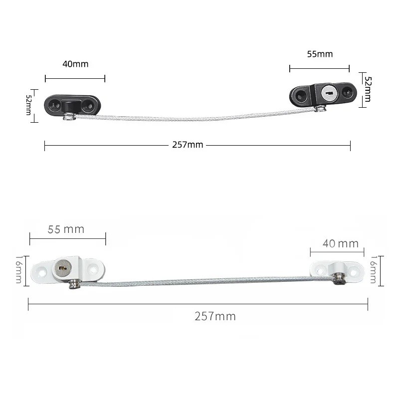 Pojistka využívá pevné kovové lanko o délce 257 mm, které spojuje dvě montážní části. Ty se připevňují pomocí šroubů a vytvářejí mechanickou zábranu proti plnému otevření dvířek. Konstrukce je navržena tak, aby odolala běžnému používání a zároveň umožnila jednoduché ovládání dospělou osobou.