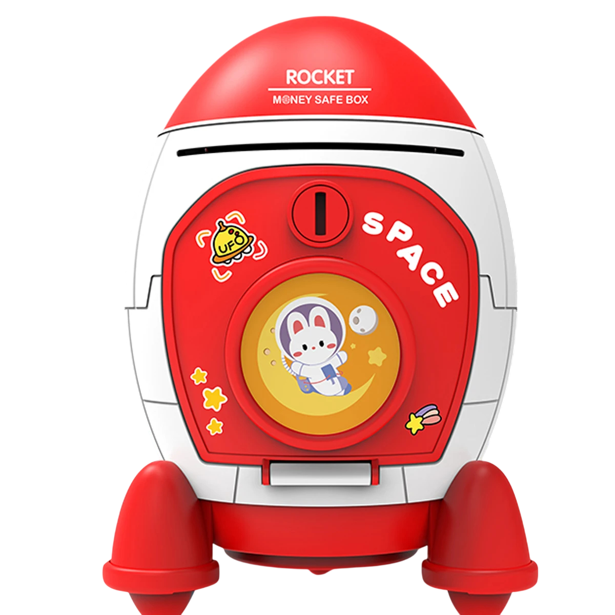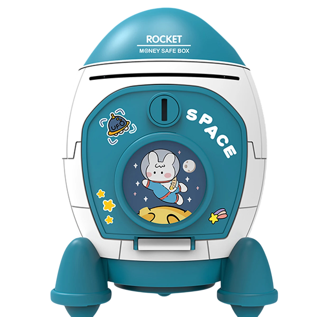 Tato dětská pokladnička ve tvaru rakety nabízí hravý způsob, jak děti vést k ukládání peněz a k základům hospodaření. Svým provedením připomíná vesmírnou raketu a na přední straně má dvířka pro snadný přístup k uloženým mincím. V horní části je slot na vhazování mincí, který umožňuje jednoduché a rychlé ukládání. Díky kompaktním rozměrům se pokladnička snadno vejde na poličku, stůl i do menšího prostoru.