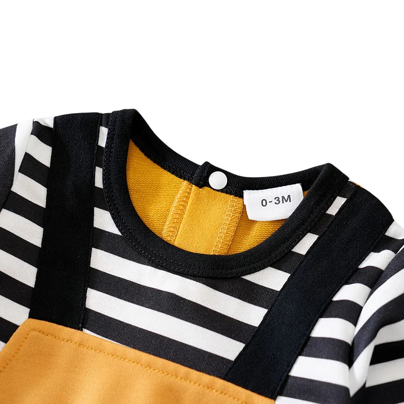 - Kreslené kšandy s pruhovaným tričkem – zábavný tištěný efekt vícevrstvého oblečení