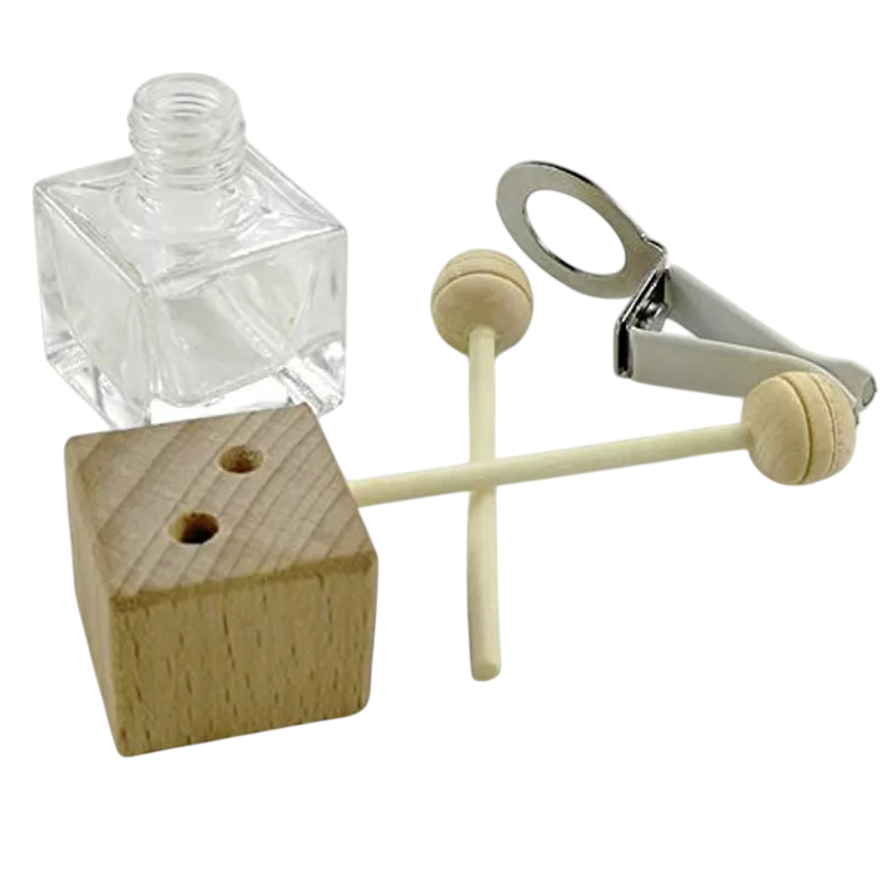 Lahvička je vyrobena ze skla a doplněna o dřevěné víčko, které spolupracuje s vnitřními tyčinkami pro postupné uvolňování vůně. Součástí je také kovový klip, který umožňuje uchycení například na ventilační mřížku v autě. Díky tomu lze difuzér umístit na viditelné i praktické místo v interiéru.