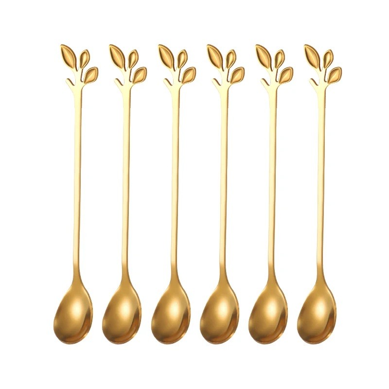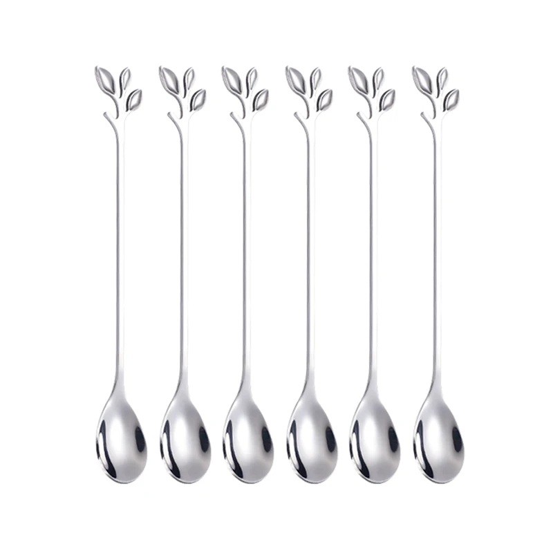 Dlouhá čajová lžička z nerezové oceli Dekorativní listová rukojeť Dezertní lžičky na kávu čaj zmrzlinu ovoce Elegantní příbory 6ks