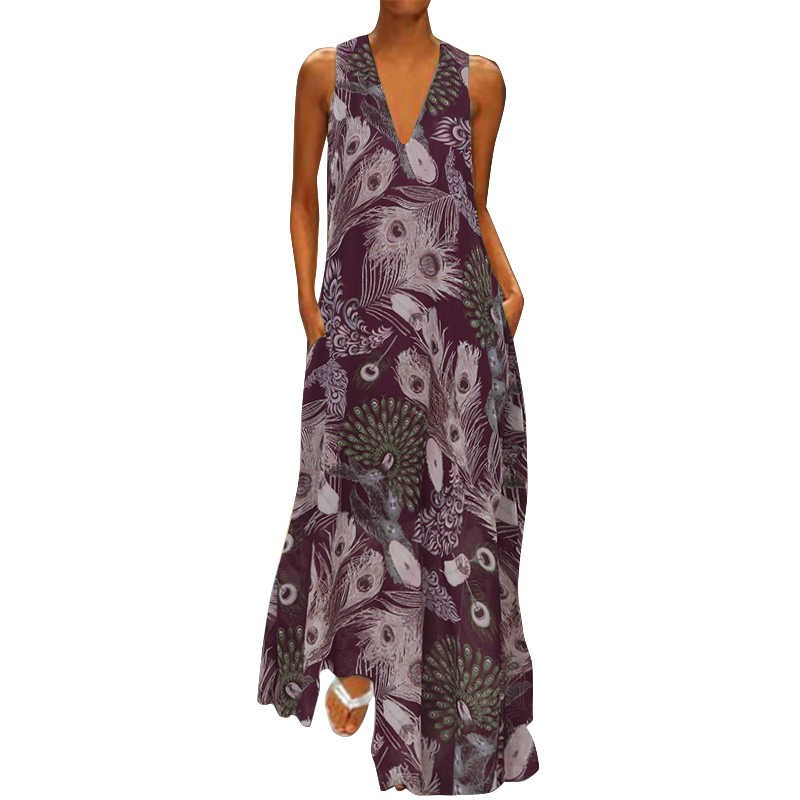 Dámské letní maxi šaty s krásným pavím vzorem.