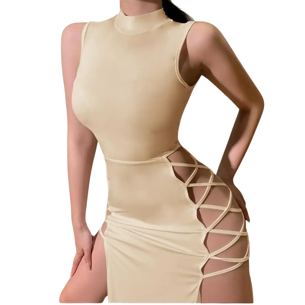 Dlouhé výrazné šaty z elastického materiálu Přiléhavé šaty se stojáčkem Bez rukávů Odhalené boky Šněrování na bocích v křížovém stylu