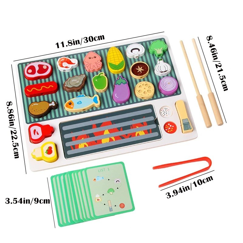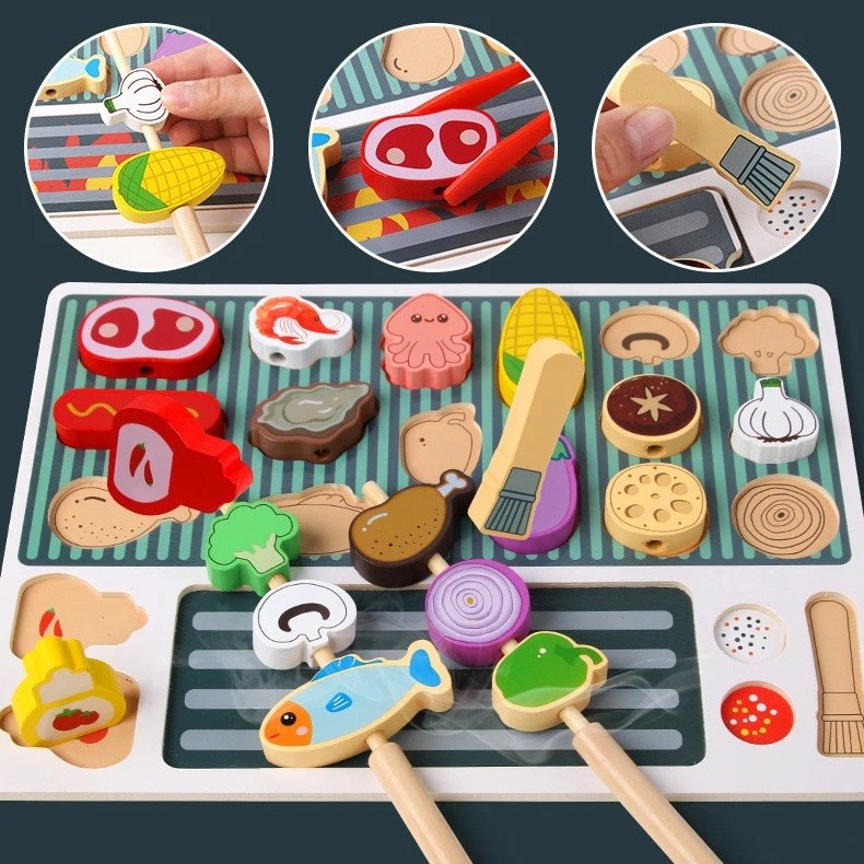 Dřevěná grilovací sada přináší zábavnou hru na kuchaře, při které si děti mohou skládat vlastní špízy, kombinovat různé druhy zeleniny, masa, ryb a mořských plodů a plnit úkoly podle obrázkových kartiček. Barevné dílky jsou vyřezané přesně do tvarů a zapadají do vyznačených otvorů na desce, což podporuje jemnou motoriku a koordinaci ruky a oka. Grilovací deska má vyjímatelnou vložku s plamínky, takže děti mohou simulovat „zapálení ohně“ a připravit si vše jako při skutečném grilování.