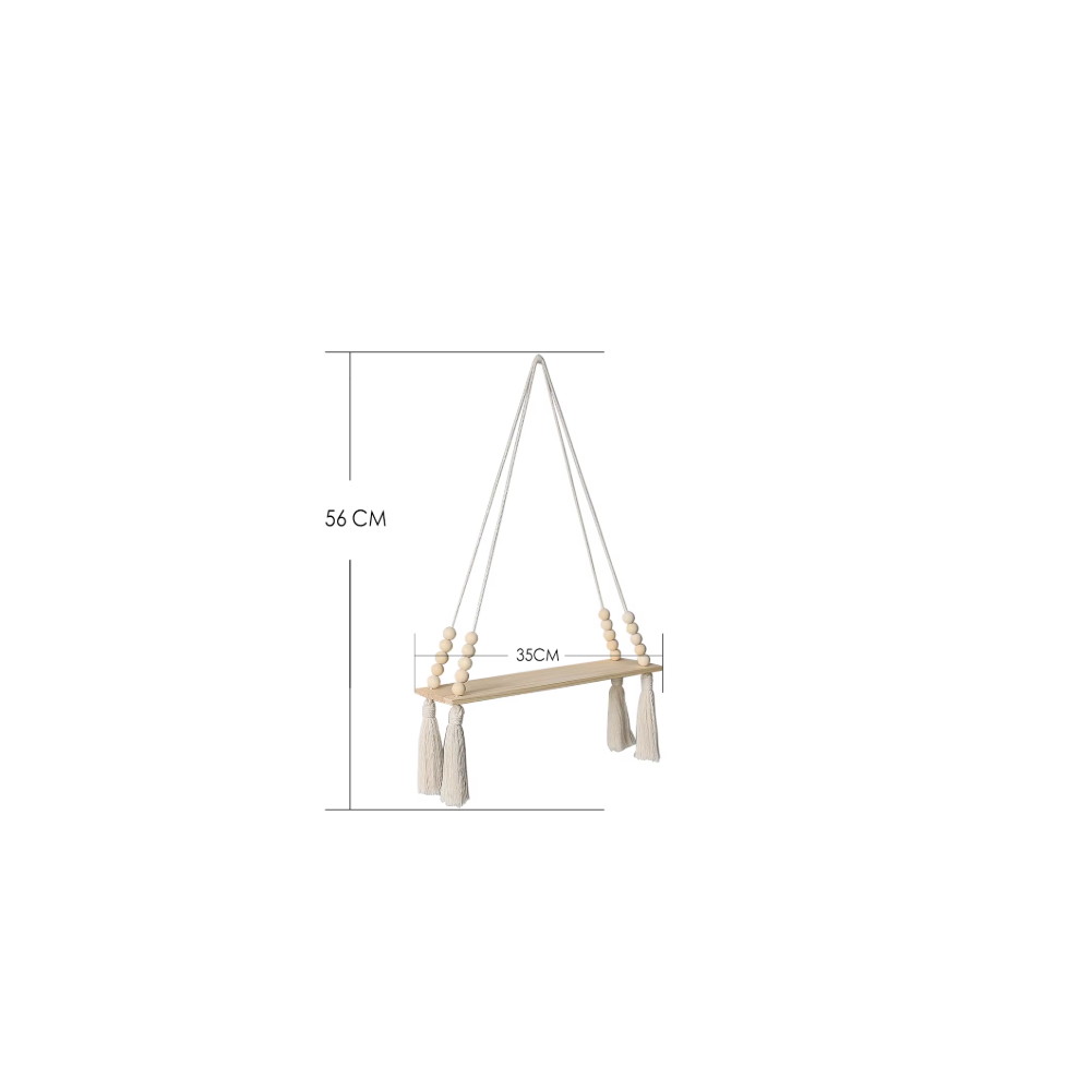 Tato dřevěná nástěnná polička 35 x 56 cm představuje stylový a praktický doplněk do každého interiéru. Závěsná konstrukce na provaze působí lehce a vzdušně, díky čemuž je ideální do obývacího pokoje, ložnice i dětského pokoje. Dekorativní provedení s korálky a střapci podtrhuje jemný přírodní vzhled a dodává prostoru osobitý charakter. Police nabízí dostatek místa pro vystavení květináčů, svíček, knih či drobných dekorací, aniž by zabírala podlahovou plochu.