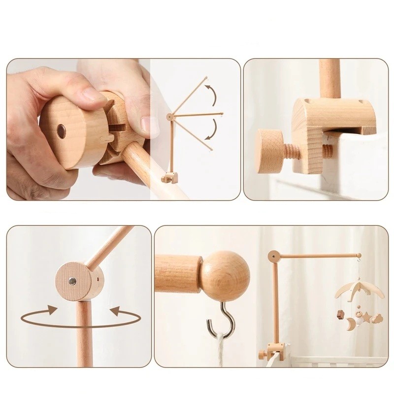 Tento dřevěný držák je ideální pro rodiče, kteří hledají bezpečné a praktické řešení pro zavěšení hraček a dekorací nad postýlku. Snadná instalace a praktické použití činí tento držák nezbytným doplňkem pro každou dětskou postýlku.