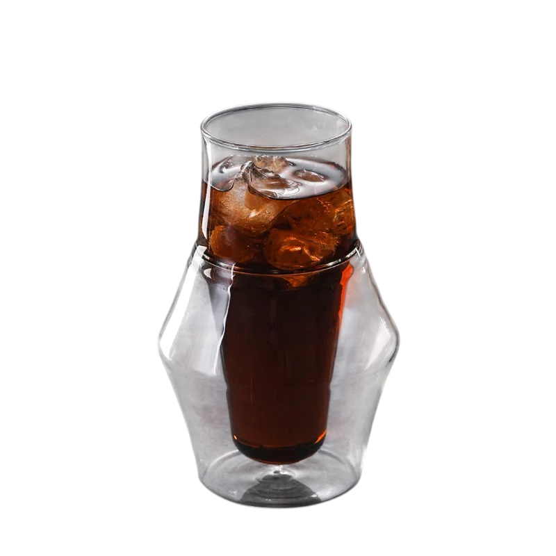 Hrnek je vyroben ze skla a jeho konstrukce s dvojitou stěnou vytváří charakteristický vizuální efekt. Nápoj je opticky oddělen od vnější části, což dodává hrnku zajímavý vzhled. Tvar je navržen tak, aby se pohodlně držel a zároveň působil stabilně při používání.
