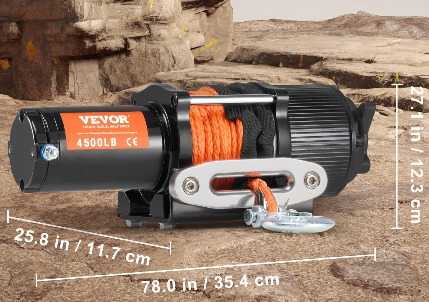 Elektrický naviják 12V s ocelovým lanem nosnost 2041 kg rozměry 35,4×11,7×12,3 cm černo oranžový pro offroad a manipulaci