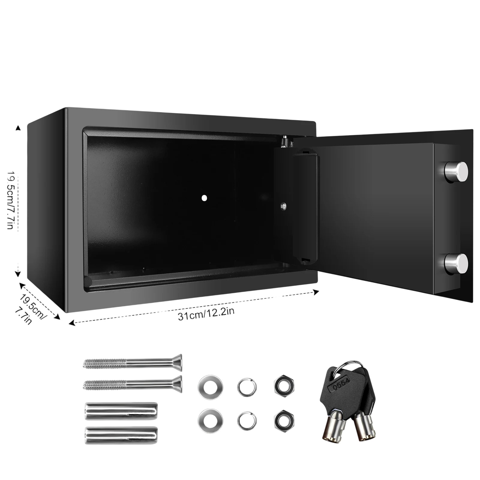 Trezor podporuje nastavení bezpečnostního kódu v délce 3–8 číslic, který lze libovolně kombinovat z číslic 0–9. Otevírání je rychlé a intuitivní, přičemž klíč slouží jako záložní způsob přístupu. Konstrukce zahrnuje vnitřní bezpečnostní panty, které zvyšují odolnost proti násilnému otevření. Díky kompaktním rozměrům 20 × 31 × 20 cm je možné trezor snadno umístit do skříně, na polici nebo jej pevně ukotvit ke zdi.