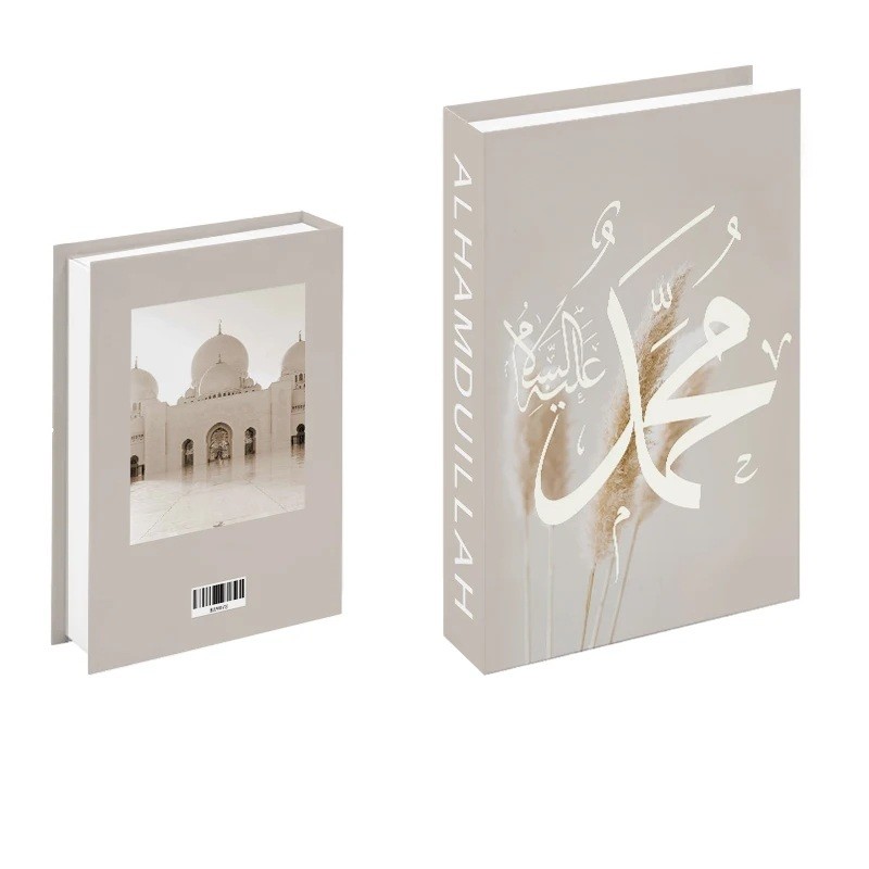 Moderní falešná kniha v jemném béžovém provedení zaujme výraznou kaligrafií „Muhammad“ na přední straně a nápisem „Alhamdulillah“ na hřbetu. Kombinace minimalistického pozadí s decentním přírodním motivem travin vytváří klidnou a harmonickou atmosféru. Přestože působí jako skutečná publikace, jedná se o neotevíratelnou dekorativní atrapu, která slouží výhradně jako stylový doplněk do interiéru. Elegantní barevné ladění působí nadčasově a snadno se kombinuje s dalšími doplňky.