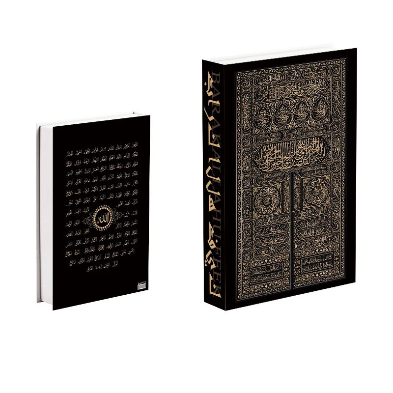 Zadní strana je doplněna jemným textovým motivem a dekorativním symbolem, což dodává výrobku jedinečný charakter z každého úhlu pohledu. Hřbet knihy zdobí vertikální nápis „BarakAllah“, který podtrhuje celkové elegantní provedení. Tato luxusní bytová dekorace je ideální na polici, komodu, konferenční stolek nebo do knihovny. Černozlatý ornamentální design snadno zkombinujete s moderním i klasickým stylem zařízení.