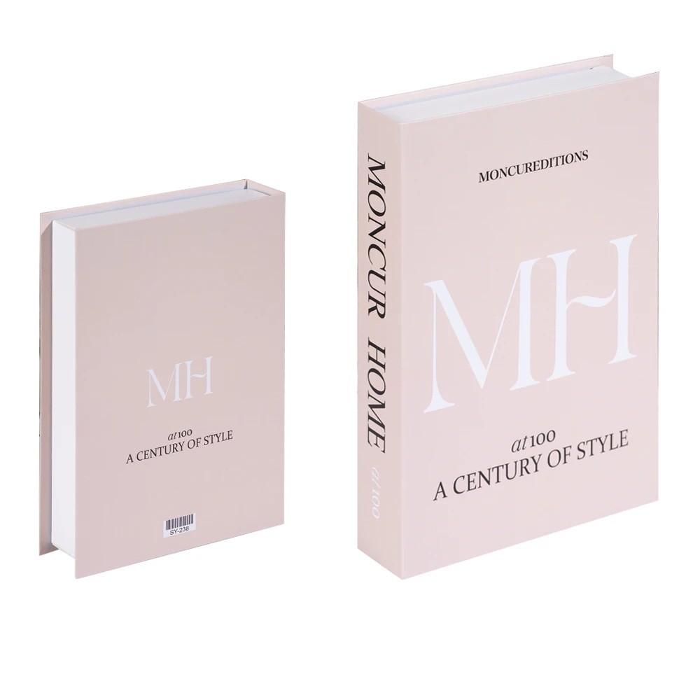 Minimalistická falešná kniha Moncur Home MH zaujme jemným růžovo-béžovým odstínem a elegantním typografickým designem. Čisté linie a decentní nápis působí luxusně a nadčasově, takže se perfektně hodí do moderního i klasického interiéru. Na první pohled vypadá jako stylová designová publikace o bydlení a módě.