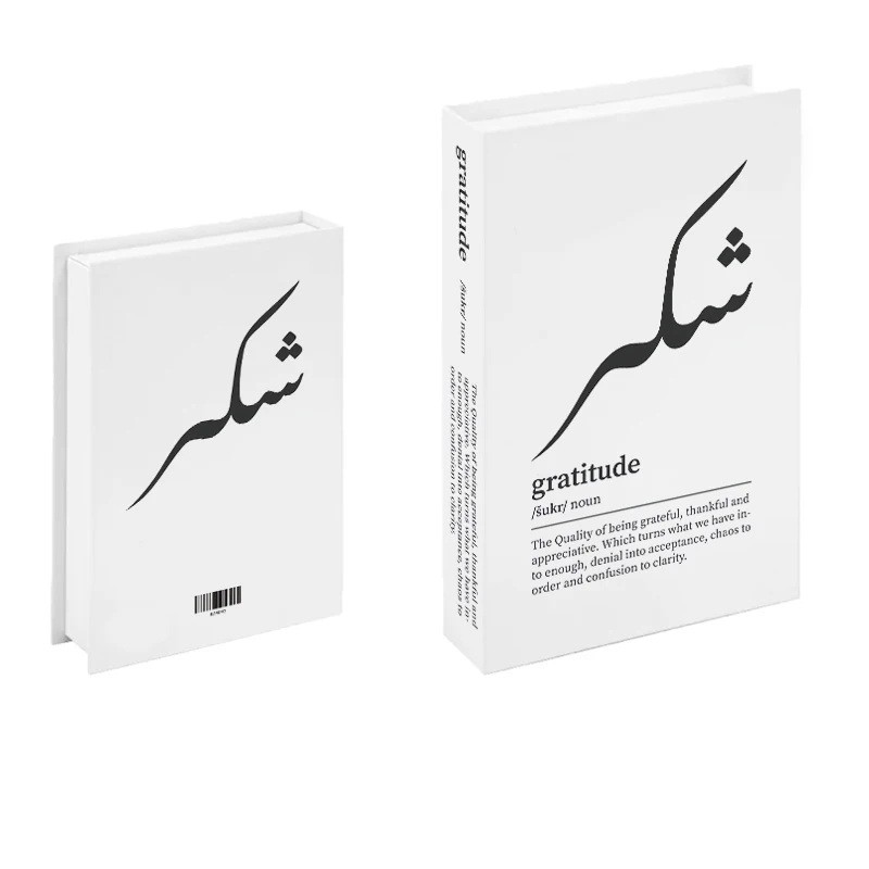 Tato moderní falešná kniha zaujme minimalistickým černobílým designem s výrazným arabským nápisem Shukr na přední straně. Spodní část obálky doplňuje anglický výraz Gratitude včetně krátké definice, která dekoraci dodává hlubší význam. Čisté linie a kontrastní provedení působí elegantně a nadčasově. Hřbet knihy je opatřen textem gratitude, díky čemuž maketa přirozeně zapadne mezi ostatní knihy v knihovně. Praktickým benefitem je otevíratelné provedení se skrytým úložným prostorem.