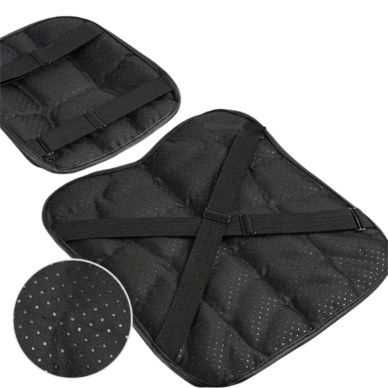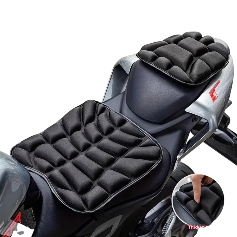 3D tvarování podložek je navrženo tak, aby poskytovalo stabilní oporu při jízdě. Povrch je prodyšný, což napomáhá cirkulaci vzduchu a zvyšuje komfort při delším používání. Konstrukce je zaměřena na tlumení nárazů, které mohou vznikat během jízdy na nerovném povrchu. Černé provedení odpovídá vzhledu produktu na obrázku a snadno zapadne do vzhledu motocyklu.