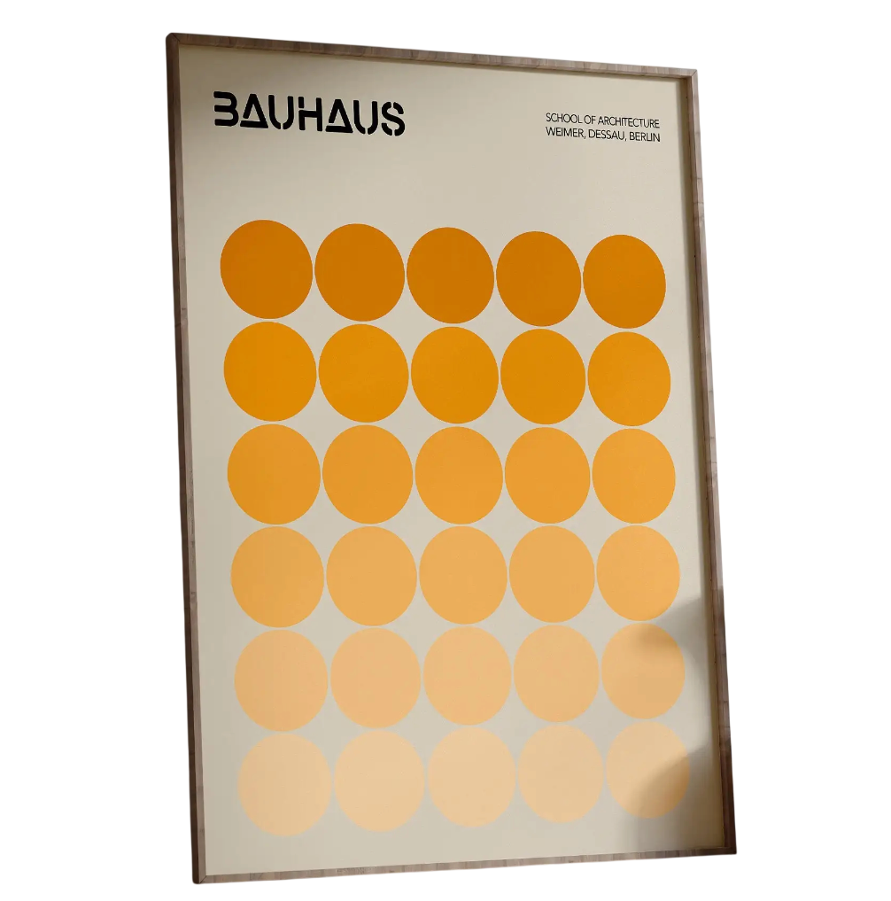 Moderně navržený plakát inspirovaný ikonickým směrem Bauhaus přináší do interiéru energii barev a čistotu geometrických tvarů. Kombinace kruhových motivů s jemným ombré přechodem z oranžové do žluté vytváří výraznou, ale zároveň harmonickou kompozici. Teplé odstíny dokážou prostor opticky prosvětlit a dodat mu příjemnou atmosféru vhodnou pro relaxaci i práci. Díky většímu formátu se dekorace stává dominantním vizuálním prvkem místnosti.