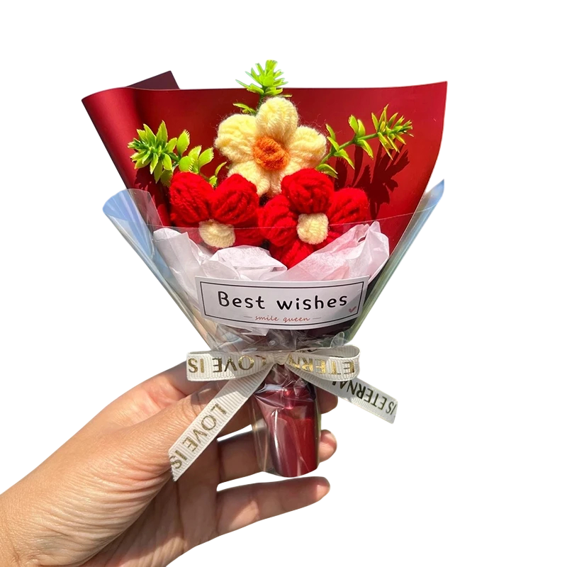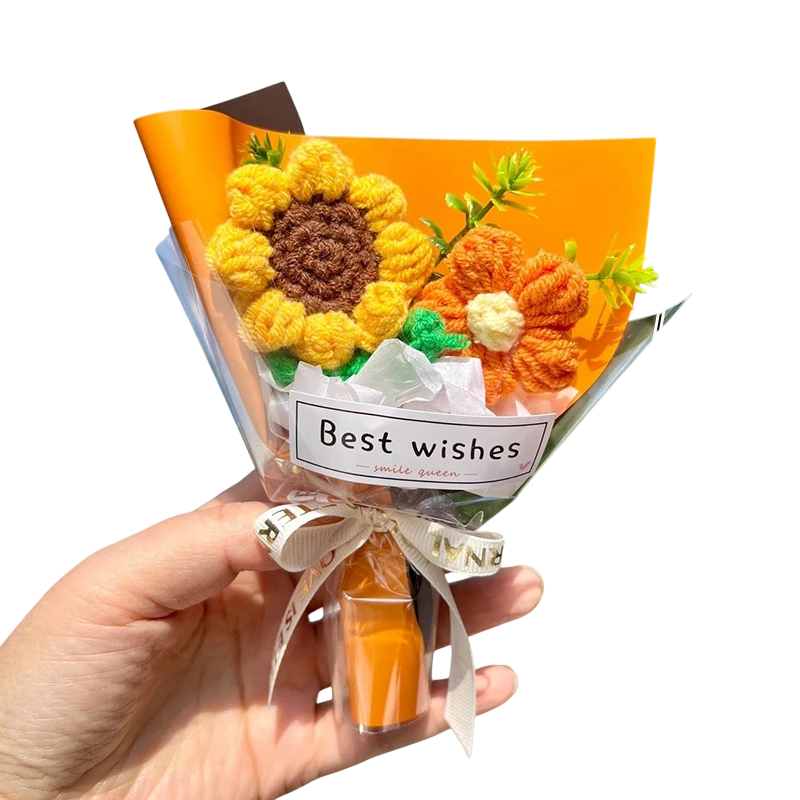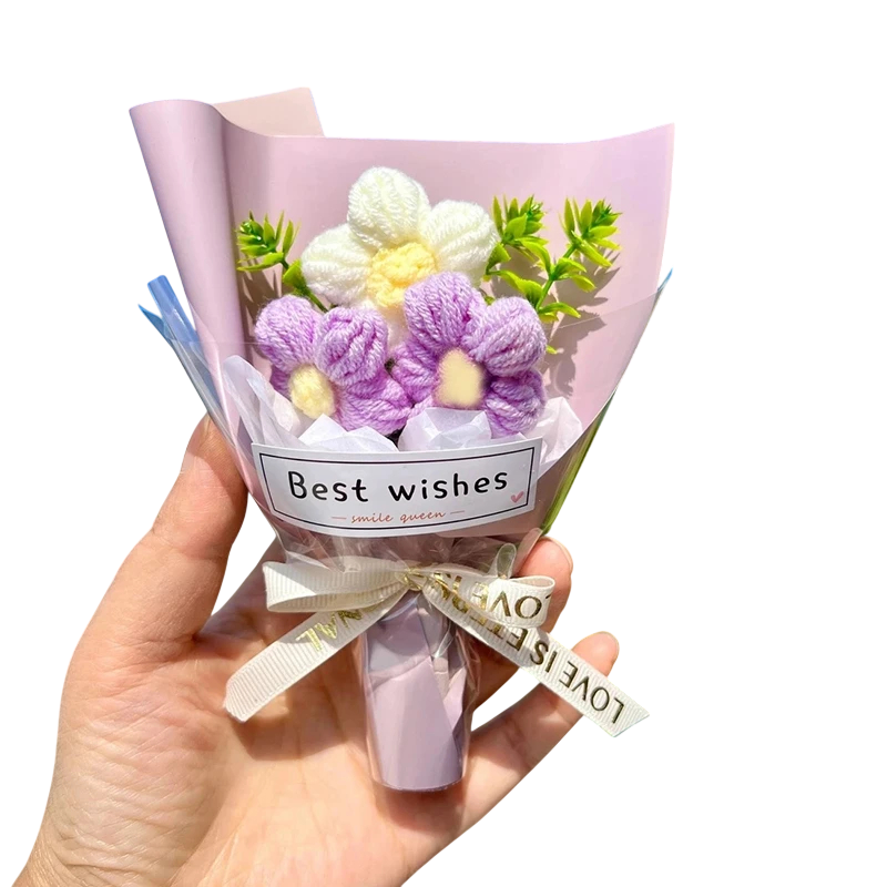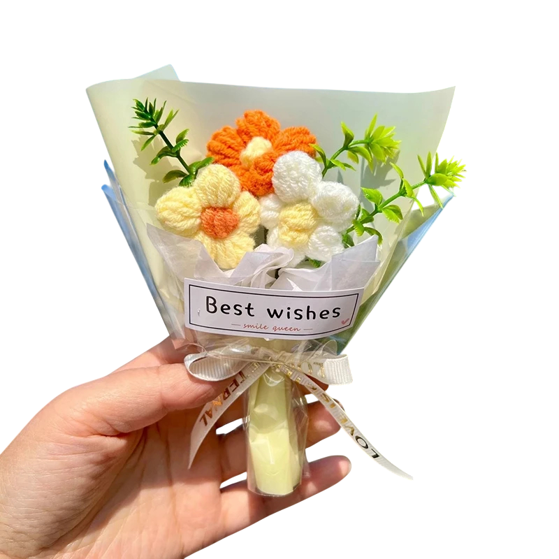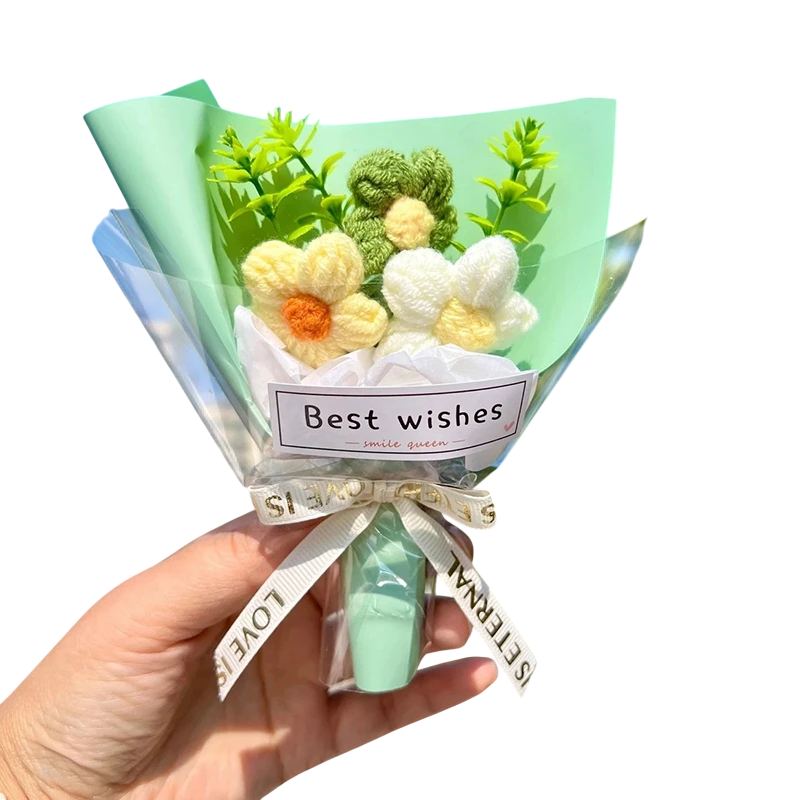 Tato dekorativní kytice nevyžaduje zalévání ani zvláštní péči. Zachovává si stále upravený vzhled a může zdobit prostor po celý rok. Háčkované květiny působí osobitě a jemně, proto jsou vhodné také jako drobná pozornost pro blízkou osobu. Díky lehké konstrukci lze kytici snadno přenášet a umístit tam, kde právě vynikne nejlépe. Dárkové balení dodává produktu hotový vzhled připravený k předání.