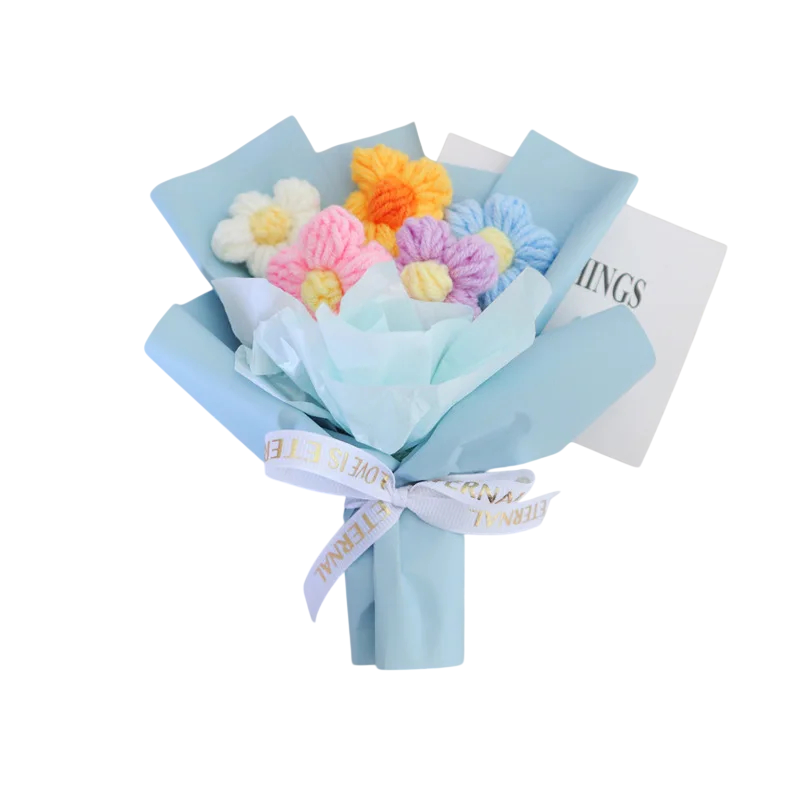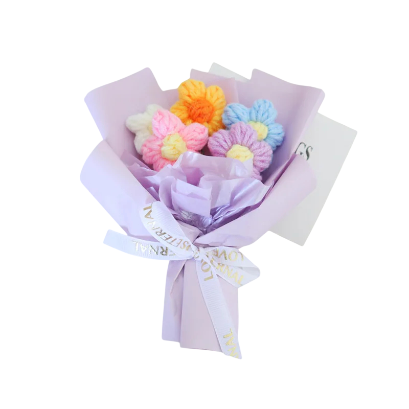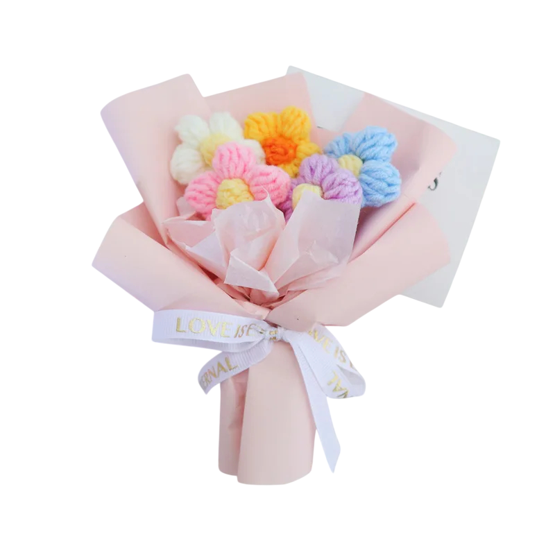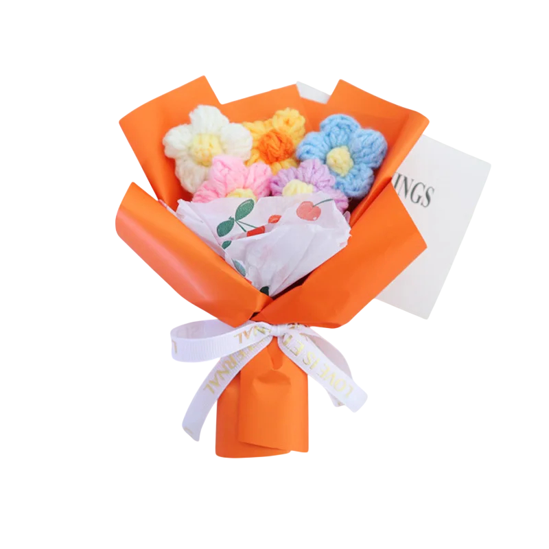 Kytice z háčkovaných květů představuje praktickou alternativu ke klasickým řezaným květinám. Díky textilnímu provedení si zachovává svůj vzhled při dlouhodobém vystavení. Ozdobný obal umožňuje okamžité použití jako dárek nebo dekoraci. Květinový motiv snadno doplní různé styly zařízení. Produkt je vhodný pro každého, kdo hledá trvalou a nenáročnou ozdobu prostoru.