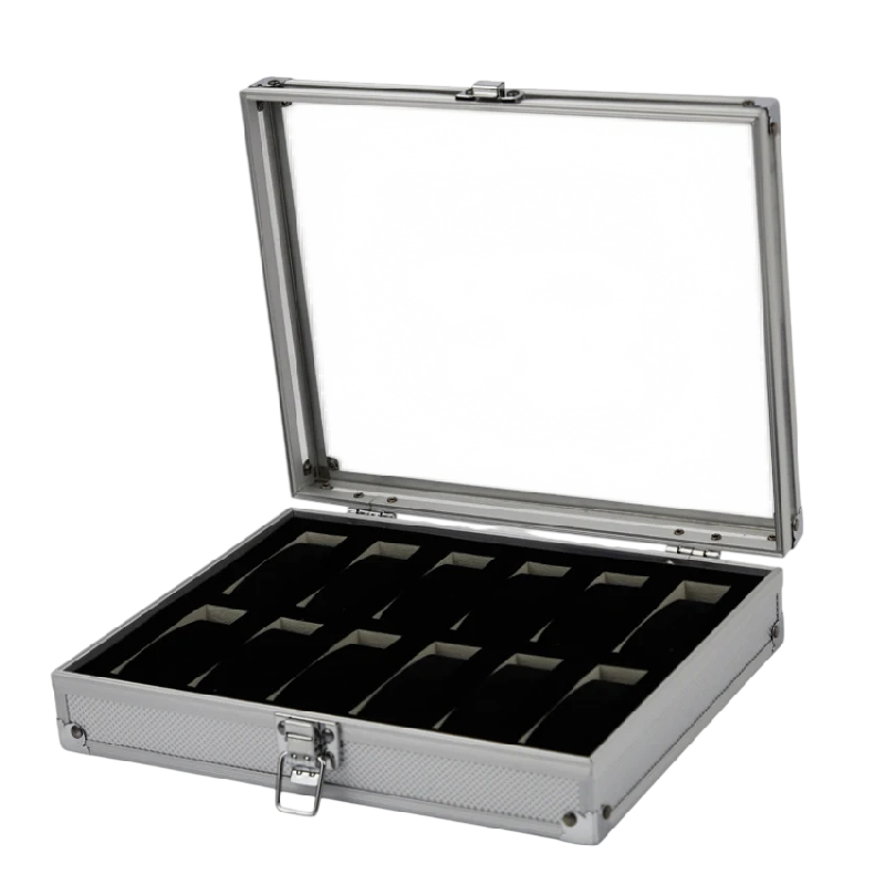 Hliníkový kufr na hodinky s 12 sloty 26x21x6,7 cm skleněné okénko stříbrný pro uložení a vystavení hodinek
