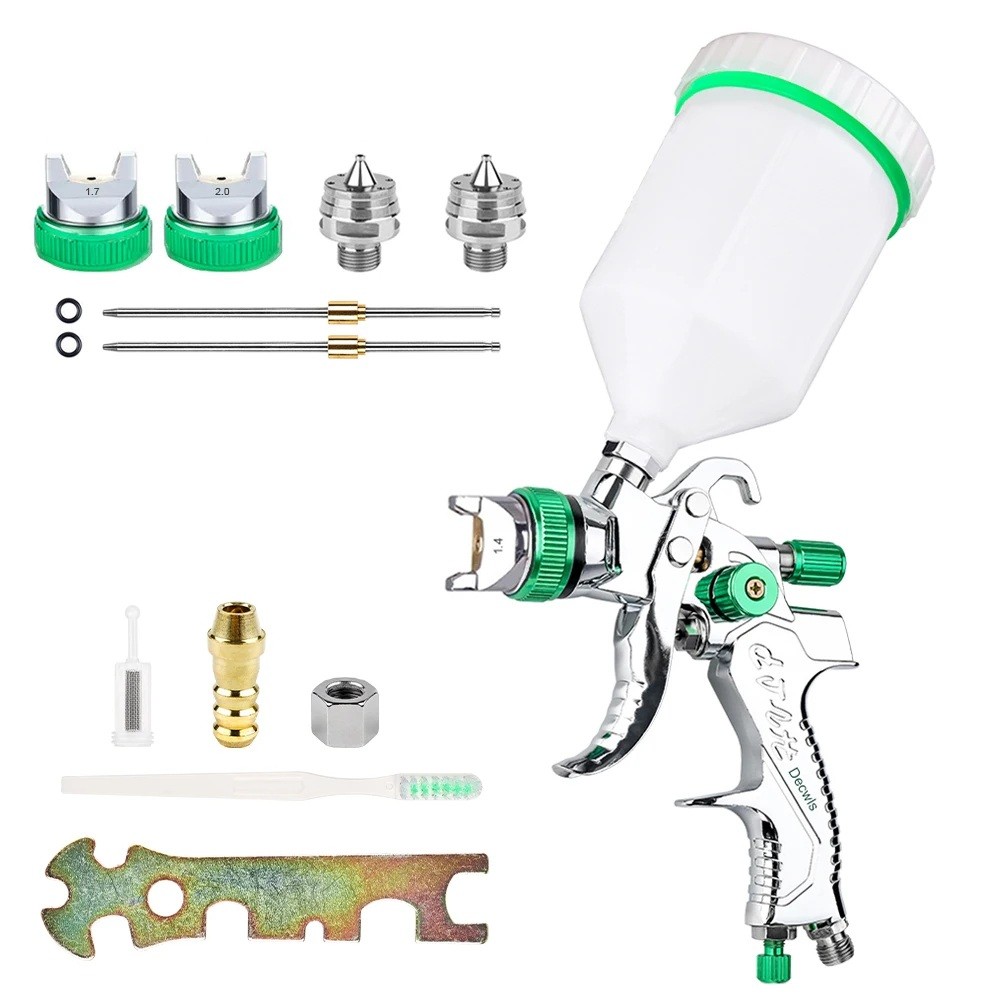 Úvodní strana Úvodní strana Auto-Moto Vybavení garáže Doplňky do garáže HVLP stříkací pistole na lakování 600 cc hliníková stříbrno zelená s tryskami 1,4 1,7 2,0 mm a příslušenstvím sada