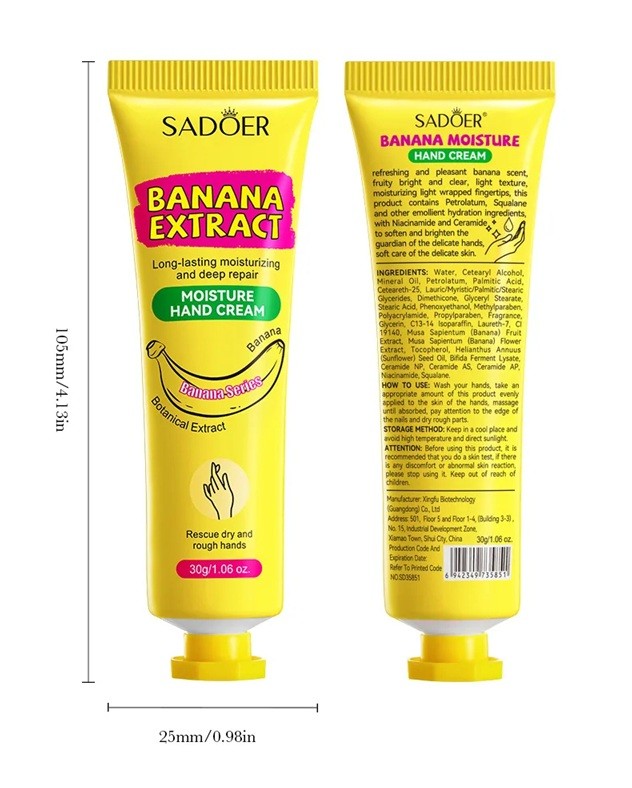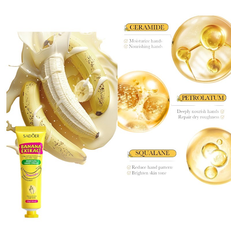 Hydratační krém na ruce Sadoer je určen pro každodenní péči o suchou a namáhanou pokožku rukou. Díky 98% obsahu banánové složky poskytuje intenzivní výživu a pomáhá zlepšit vzhled suché i popraskané kůže. Krém se příjemně roztírá a zanechává pokožku jemnou na dotek bez nepříjemného pocitu pnutí. Výrazná a příjemná banánová aroma dodává používání svěží a pozitivní pocit. Praktické balení umožňuje mít krém vždy po ruce doma, v kabelce i na cestách.