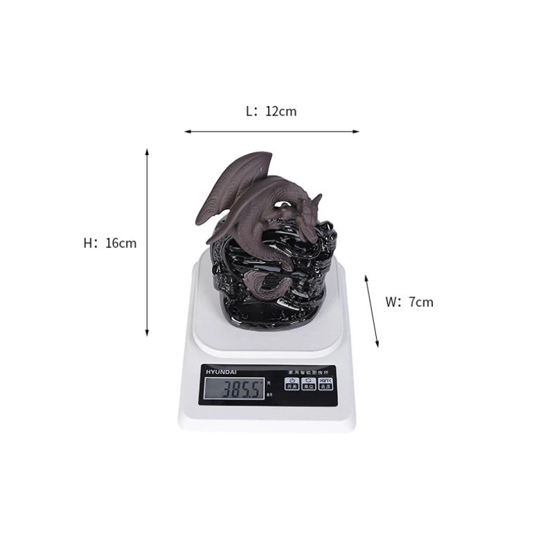 Elegantní kadidelnice s motivem draka je originálním doplňkem do každého interiéru. Díky rozměrům 16 x 12 x 7 cm je dostatečně výrazná, ale zároveň kompaktní pro umístění na stůl, komodu nebo poličku. Je vyrobena z kvalitní keramiky, která je odolná vůči teplu a snadno se čistí. Tento model je vhodný pro vonné tyčinky i vonné kužely se zpětným prouděním dýmu, které vytvářejí efektní vodopádový efekt.