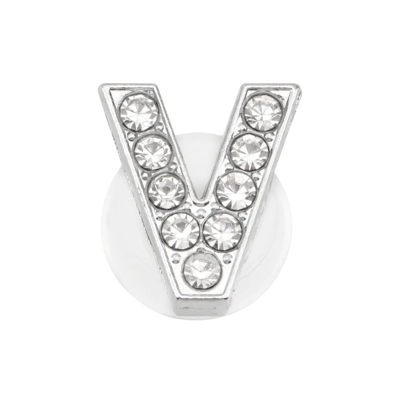 Kamínková ozdoba na crocsy písmeno V 2,5–3 cm PVC stříbrná dekorace na boty pro personalizaci obuvi a doplnění vzhledu