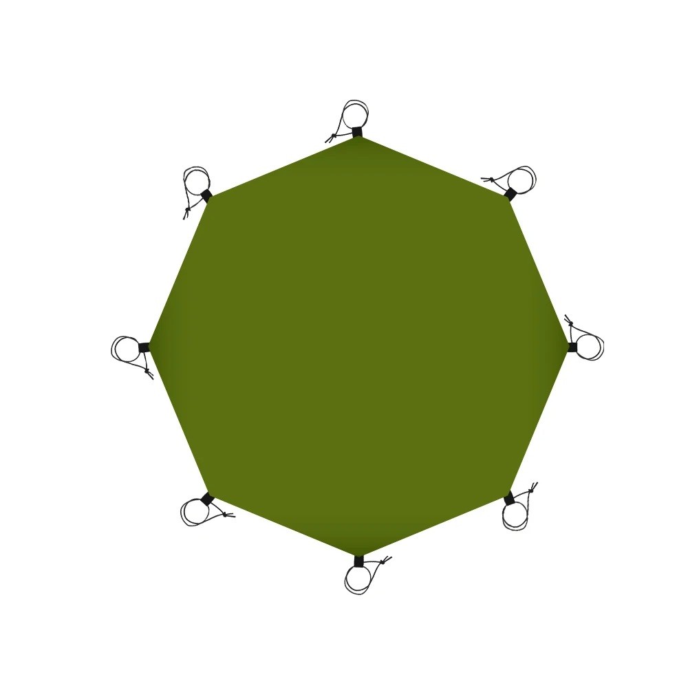 Velikost 4,1 × 4,1 m poskytuje výrazně větší plochu než běžné podložky, takže ji lze využít i pro skupinové aktivity. Osmiboký tvar umožňuje rovnoměrné rozložení prostoru a flexibilní využití podle aktuální potřeby. Podložku lze použít jako piknikovou podložku, plachtu pod stan nebo jako jednoduchý přístřešek.