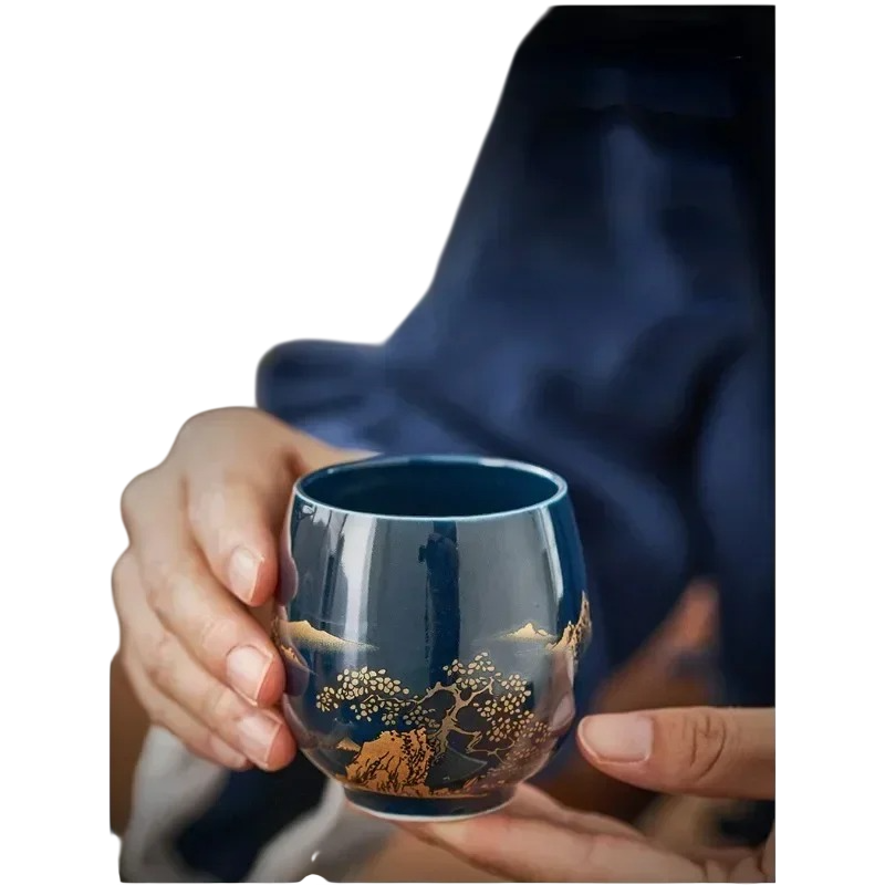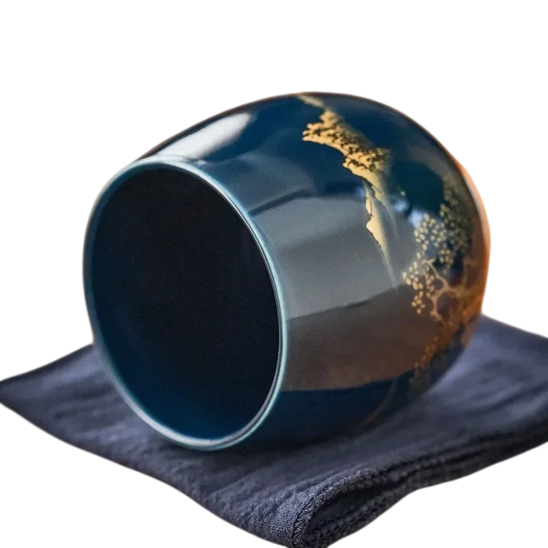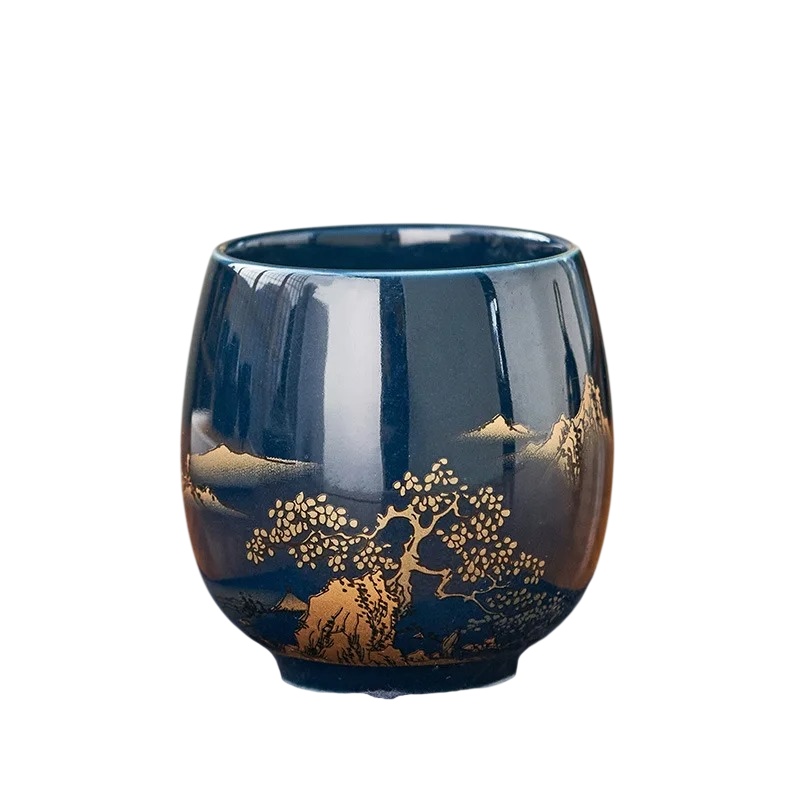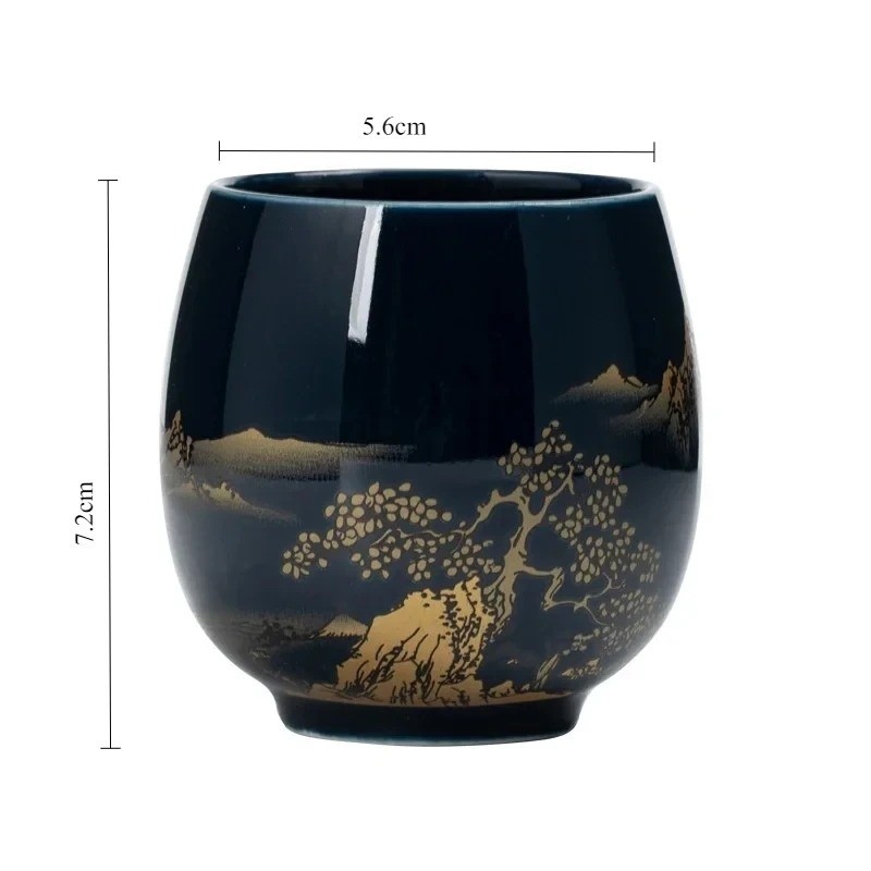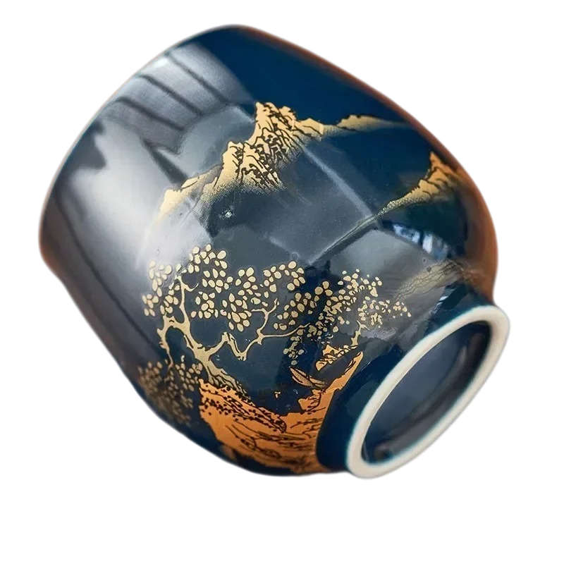 Keramický hrneček 180 ml, šálek na čaj a kávu 7,2 × 5,6 cm z keramiky tmavě modrý se zlatým dekorem krajiny pro domácí použití