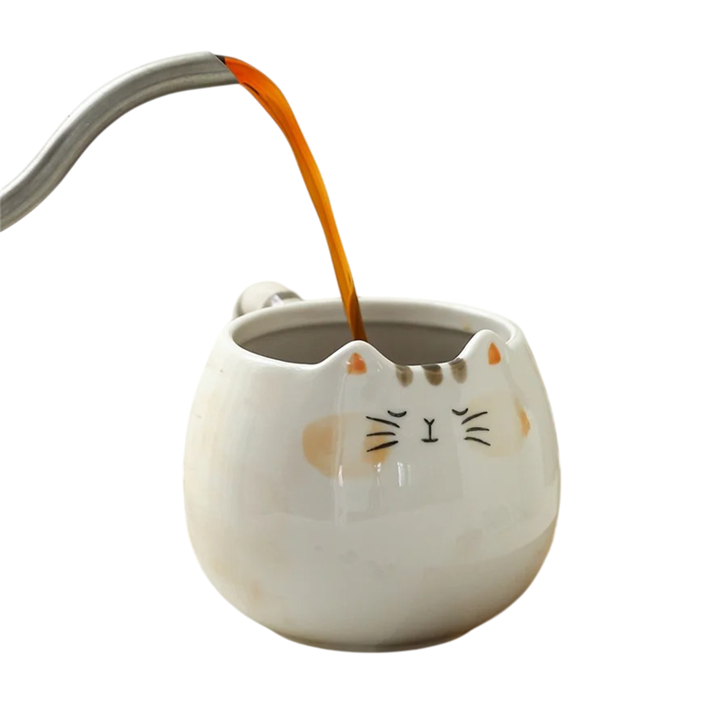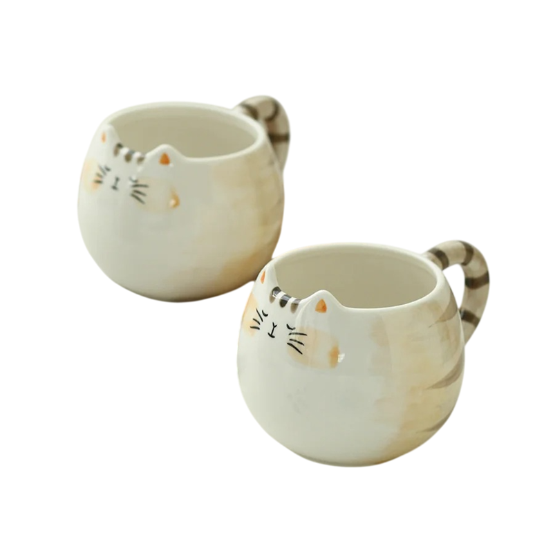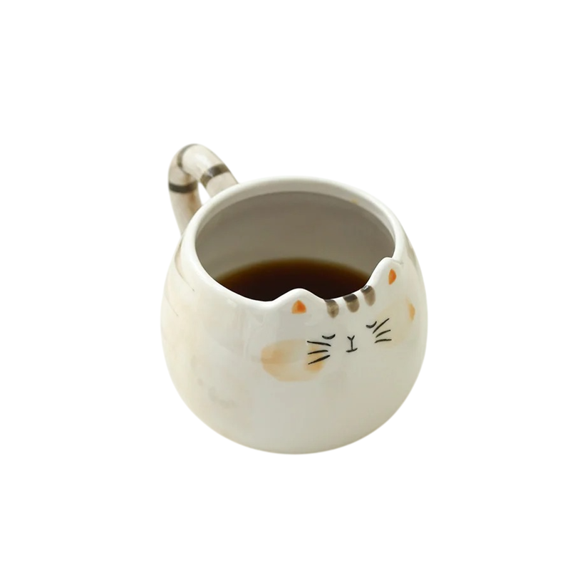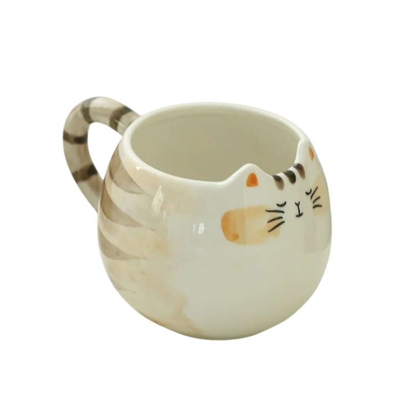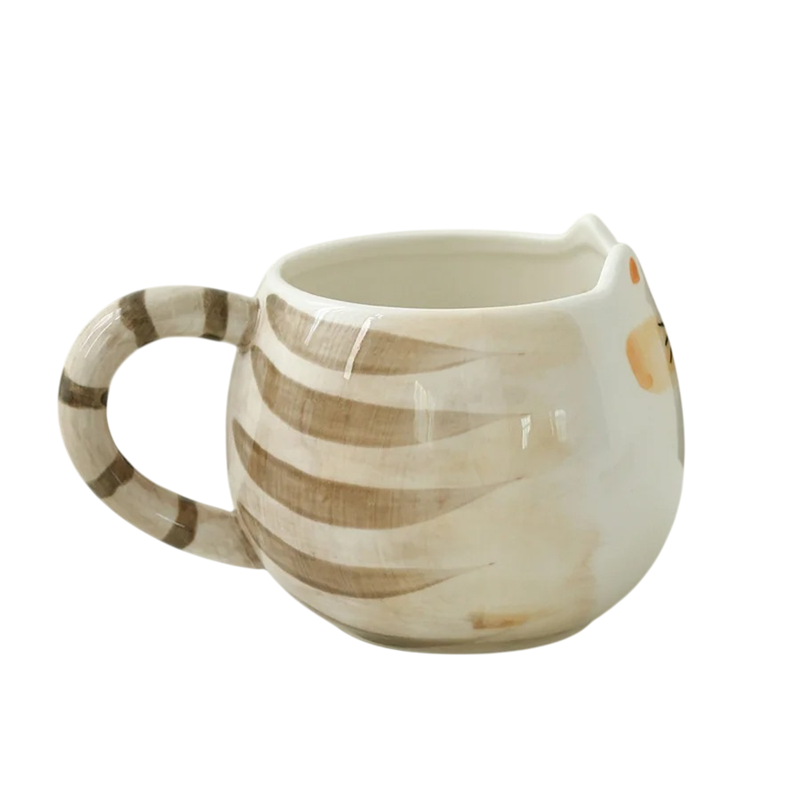 Design hrnku je inspirován vzhledem kočky. Povrch zdobí krémová barva s hnědými pruhy, které připomínají srst. Na přední straně je jednoduchý obličej kočky s detaily, jako jsou oči, nos a vousky. Horní okraj hrnku má tvar jemného výřezu, který dodává celkovému vzhledu originální charakter.