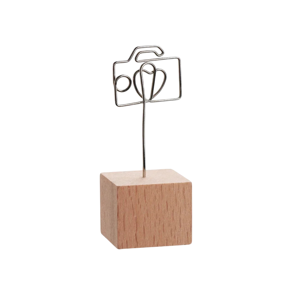 Klip na fotografie ve tvaru fotoaparátu slouží jako praktický doplněk pro vystavení snímků, poznámek nebo drobných lístků. Kovový držák je zasazen do dřevěného krychlového podstavce, což vytváří jednoduché a přirozené provedení vhodné do různých interiérů. Díky svému kompaktnímu tvaru lze stojánek umístit na pracovní stůl, polici nebo komodu. Pomáhá mít důležité informace přehledně na očích bez nutnosti jejich lepení nebo připínání. Konstrukce klipu umožňuje snadnou manipulaci a rychlou výměnu vloženého papíru.