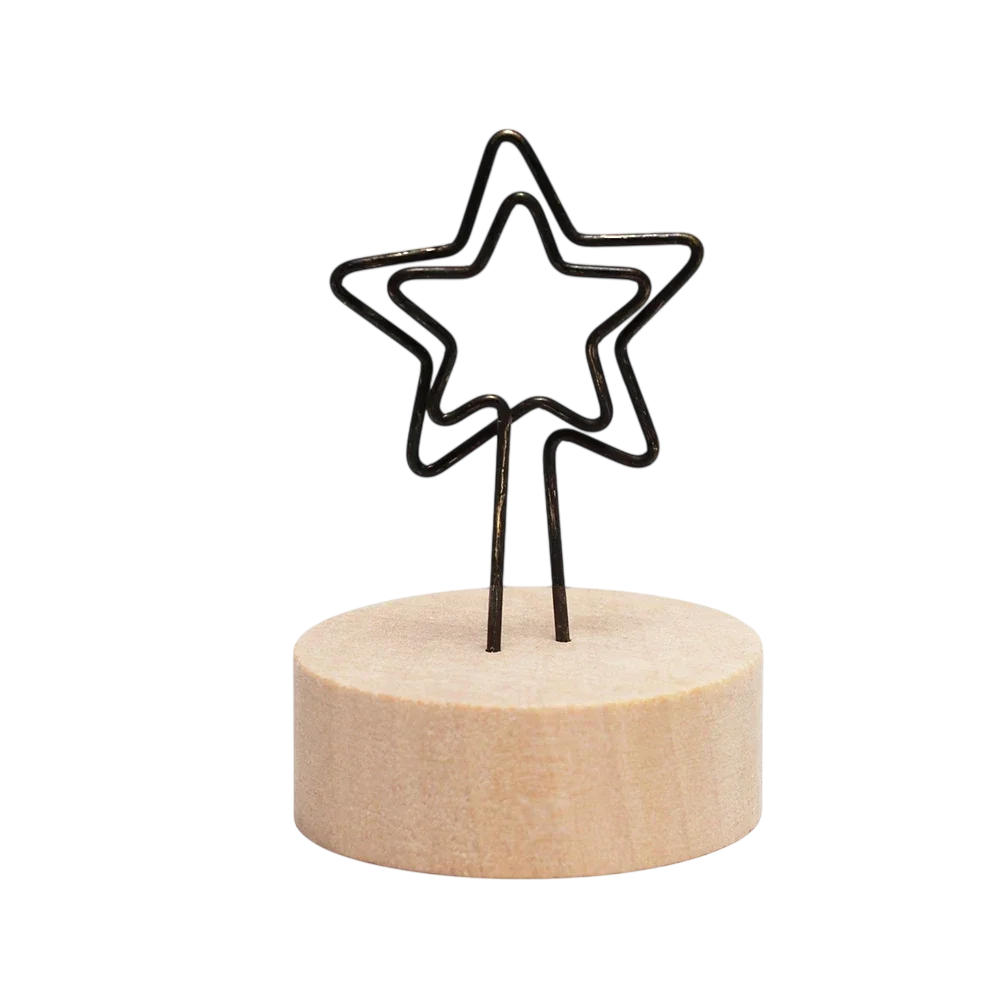 Stojánek na fotografie ve tvaru hvězdy s kovovým klipem a dřevěným podstavcem. Vhodný pro snímky i poznámky na stůl nebo polici. Celý popis