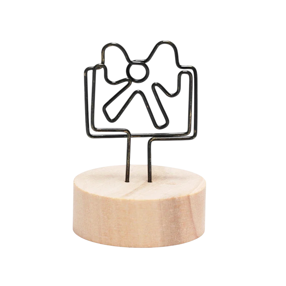Stojánek na fotografie ve tvaru mašle s kovovým klipem a dřevěným podstavcem. Vhodný pro snímky, vzkazy i poznámky v interiéru. Celý popis