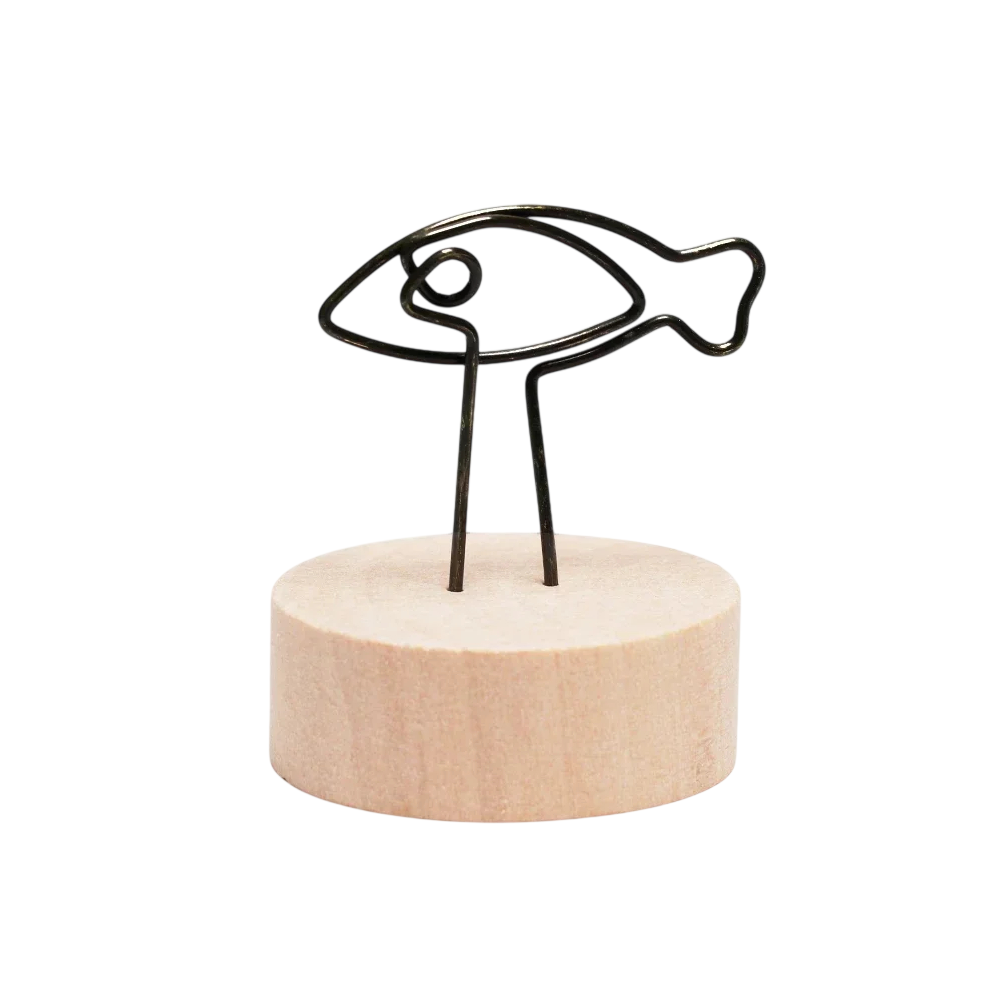 Klip na fotografie ve tvaru ryby slouží jako praktický doplněk pro vystavení snímků, poznámek nebo drobných vzkazů. Kovový držák v kombinaci s dřevěným podstavcem vytváří jednoduchý vzhled, který se snadno začlení do různých interiérů. Stojánek je vhodný na pracovní stůl, polici nebo komodu, kde pomůže mít důležité informace stále na očích. Kompaktní velikost umožňuje využití i v menších prostorech. Konstrukce klipu zajišťuje snadné uchycení i rychlou výměnu papíru.