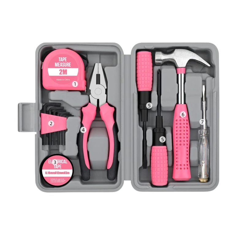 Kompaktní sada nářadí Hi-Spec 13 ks s kladivem 2 m metrem šroubováky kleštěmi růžovo černá pro domácí opravy a údržbu
