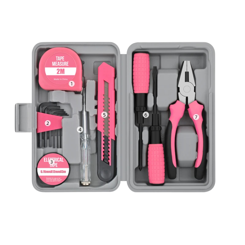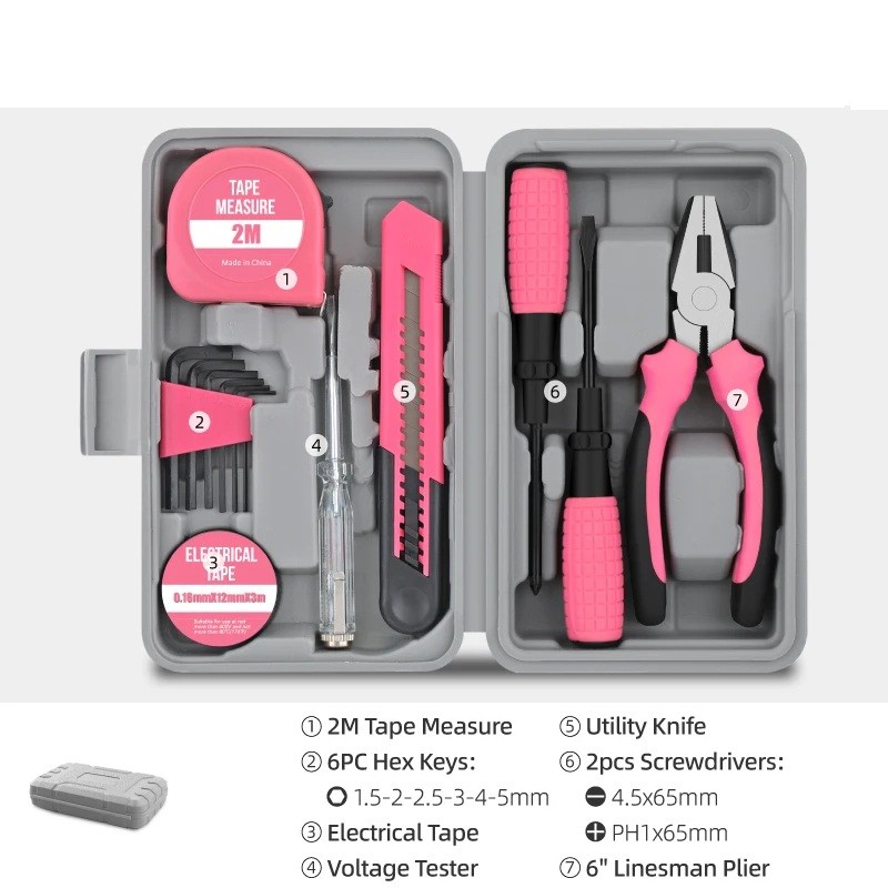 Kompaktní sada nářadí Hi-Spec 13 ks s měřicím pásmem 2 m šroubováky kleštěmi a nožem růžovo černá pro domácnost