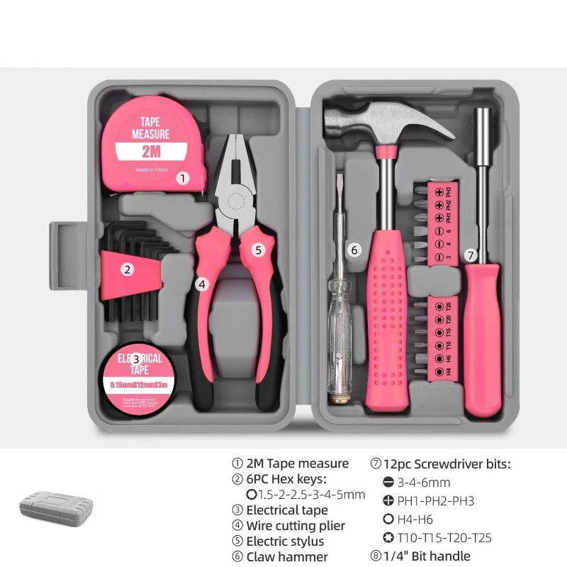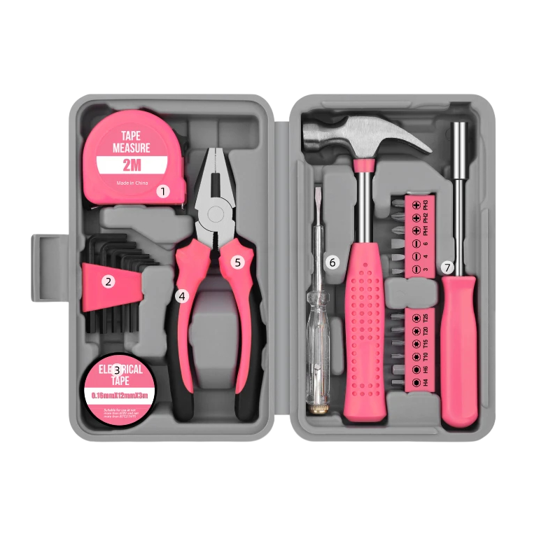 Kompaktní sada nářadí Hi-Spec 24 ks s kladivem 2 m metrem bity a kleštěmi růžovo černá pro domácí opravy a údržbu