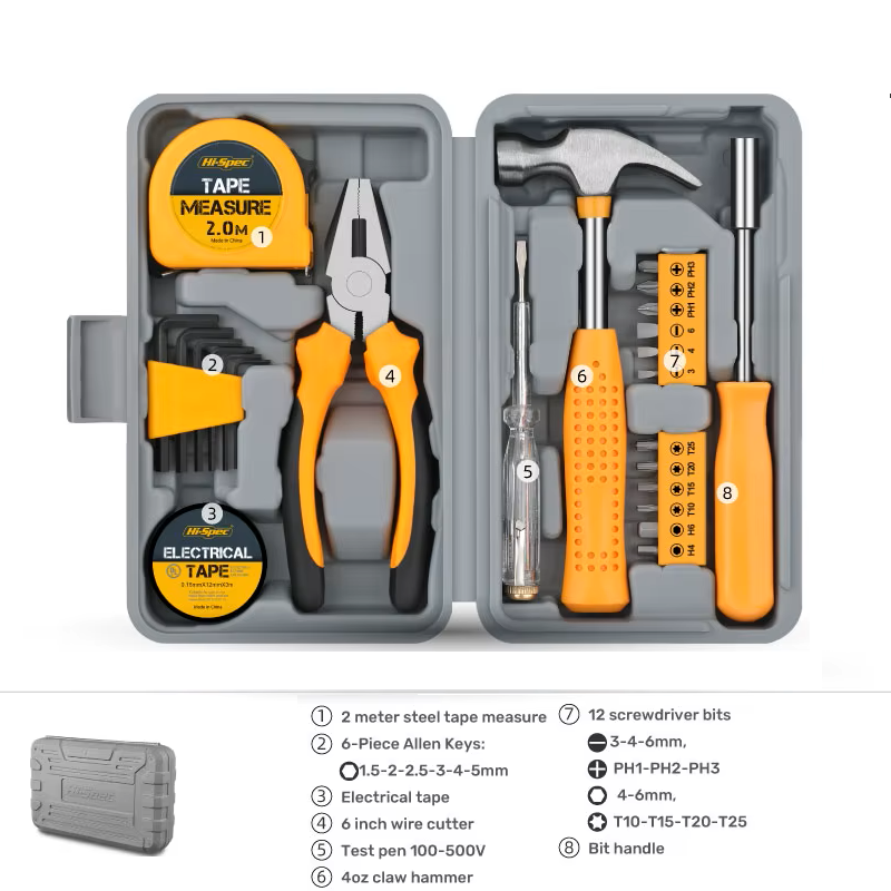 Kompaktní sada nářadí Hi-Spec 24 ks s kladivem 2 m metrem bity a kleštěmi žluto černá pro domácí opravy a údržbu
