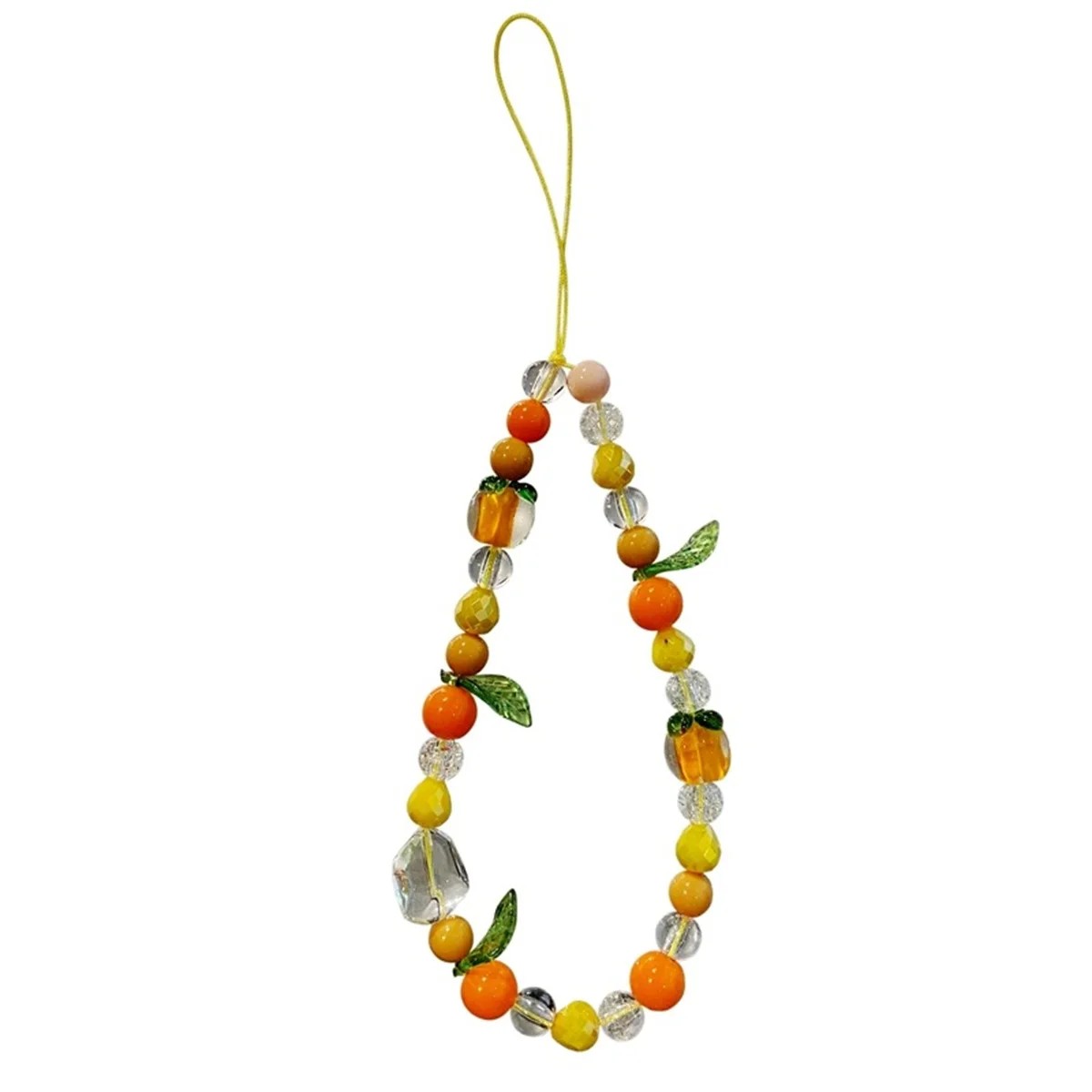 Praktický a stylový doplněk, který dodá vašemu telefonu jedinečný vzhled a zároveň pomůže zvýšit jeho bezpečnost při používání. Tento dekorativní řetízek je vyroben z různých typů korálků, které vytvářejí hravý design inspirovaný ovocnými motivy. Kombinace barev žlutá, oranžová, zelená a transparentní působí svěže a moderně, díky čemuž se skvěle hodí k různým stylům mobilních pouzder.